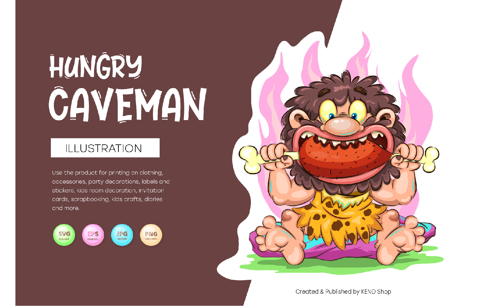 A funny illustration of a caveman eating a piece of meat on a bone. Children's bright illustration. Use the product for printing on clothing, accessories, party decorations, labels and stickers, kids room decoration, invitation cards, scrapbooking, kids crafts, diaries and more.