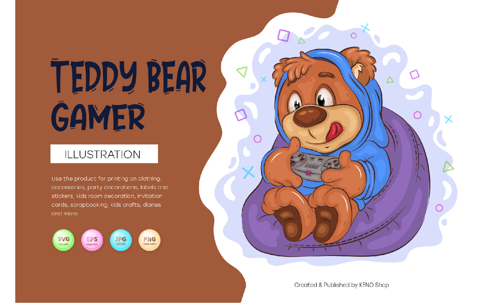 Cartoon Teddy Bear Gamer. T-Shirt, PNG, SVG. Vector Graphic