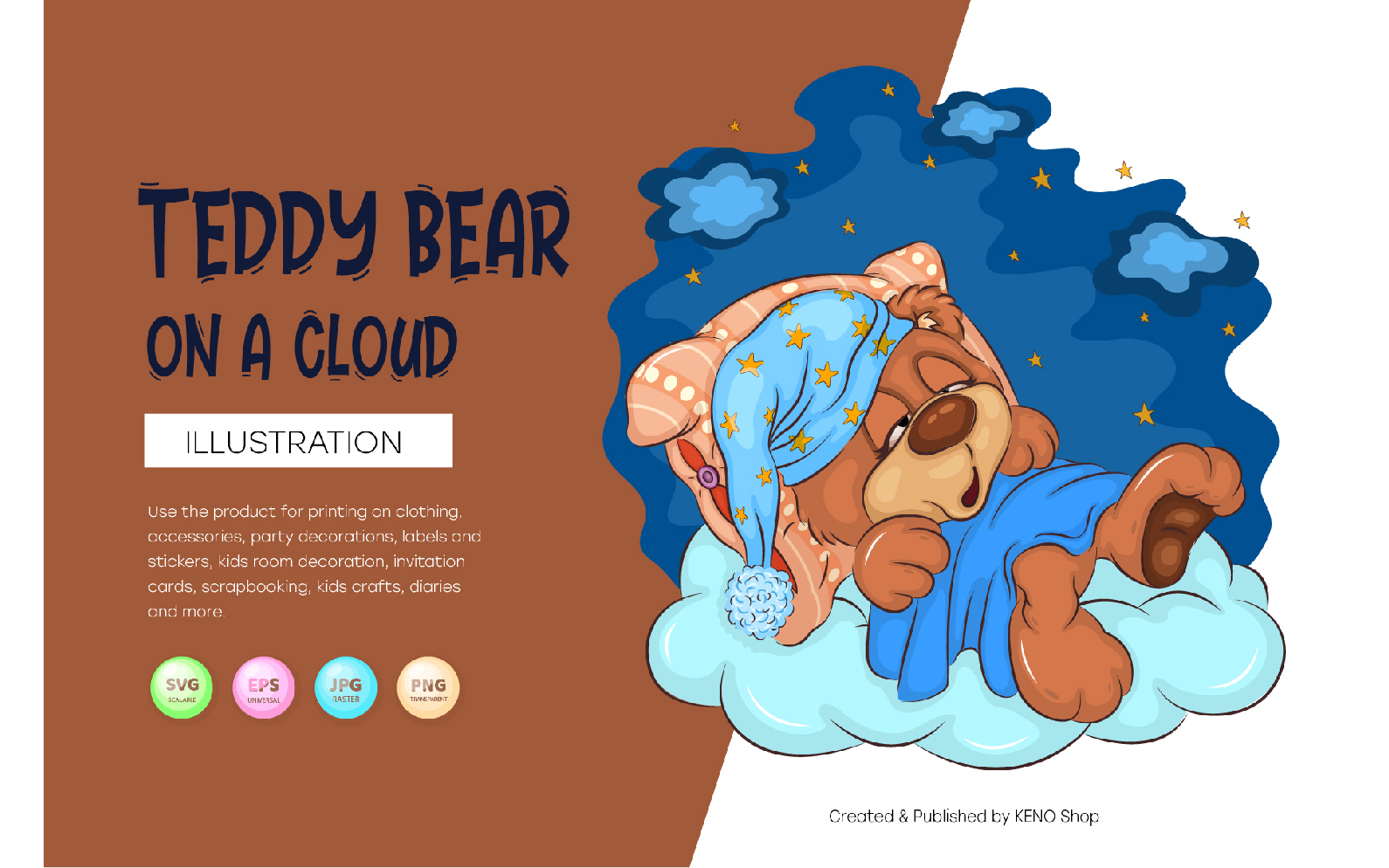 Cute illustration of cartoon teddy bear sleeping on a cloud. Unique design, Children's illustration. Use the product for printing on clothing, accessories, party decorations, labels and stickers, kids room decoration, invitation cards, scrapbooking, kids crafts, diaries and more.