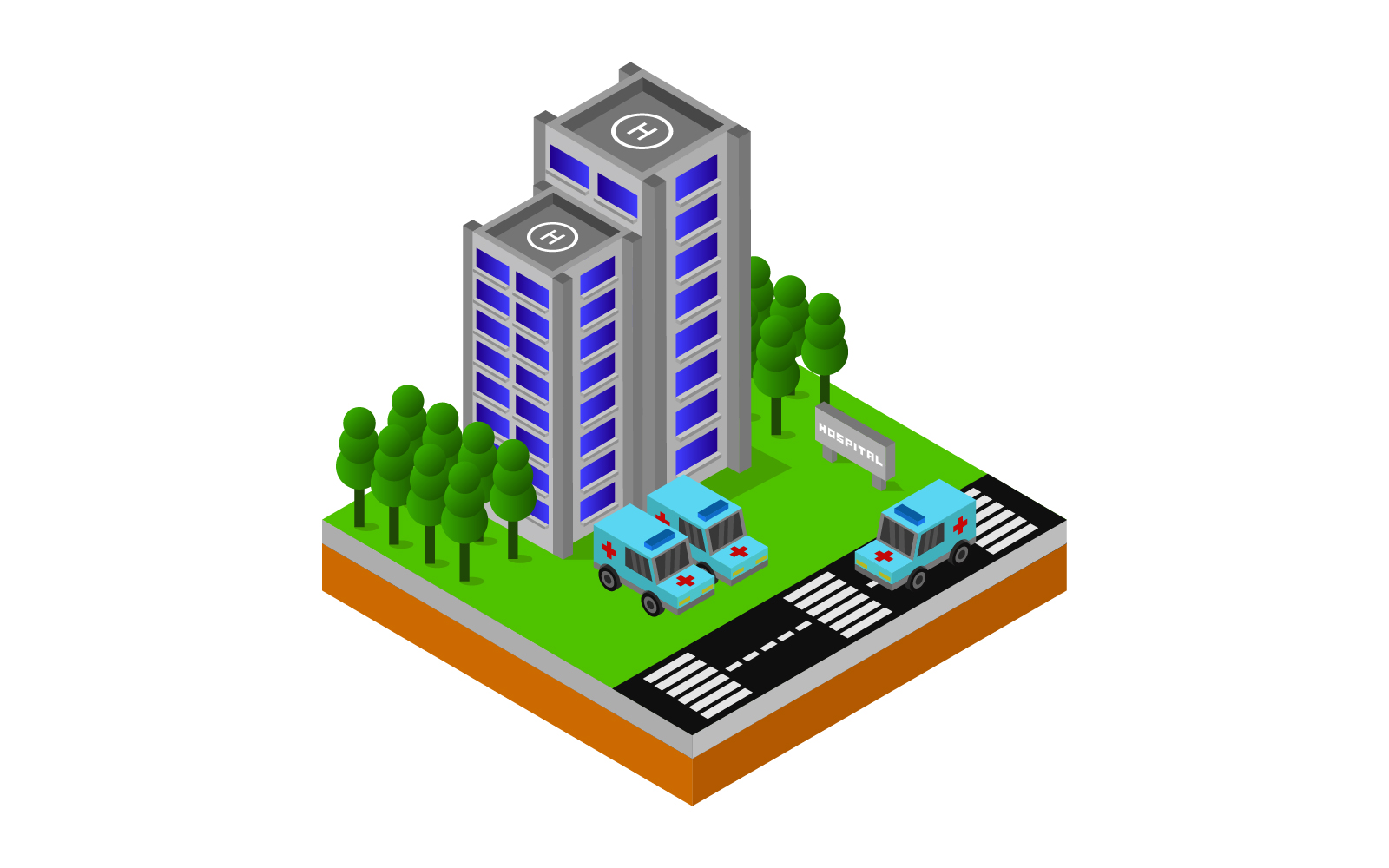 detailed and high quality isometric hospital, colored and illustrated in vector on a white background divided into the various vector paths and in EPS format available for Adobe Illustrator and usable for any support and graphic use ready for immediate use for your graphic projects