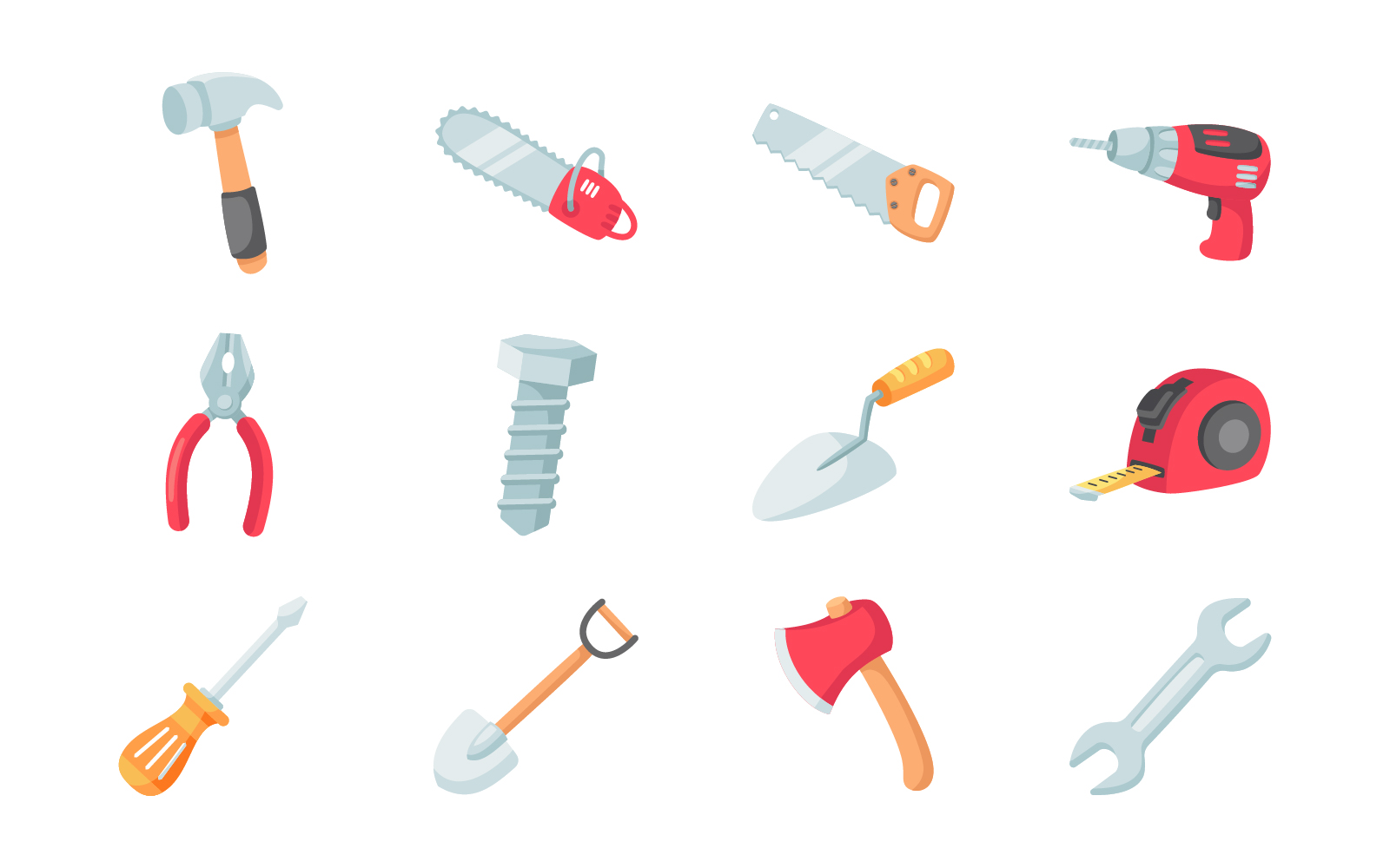 This set contains hammer, chainsaw, handsaw, drilling machine, plier, screw, trowel, measuring tape, screwdriver, shovel, axe and wrench.