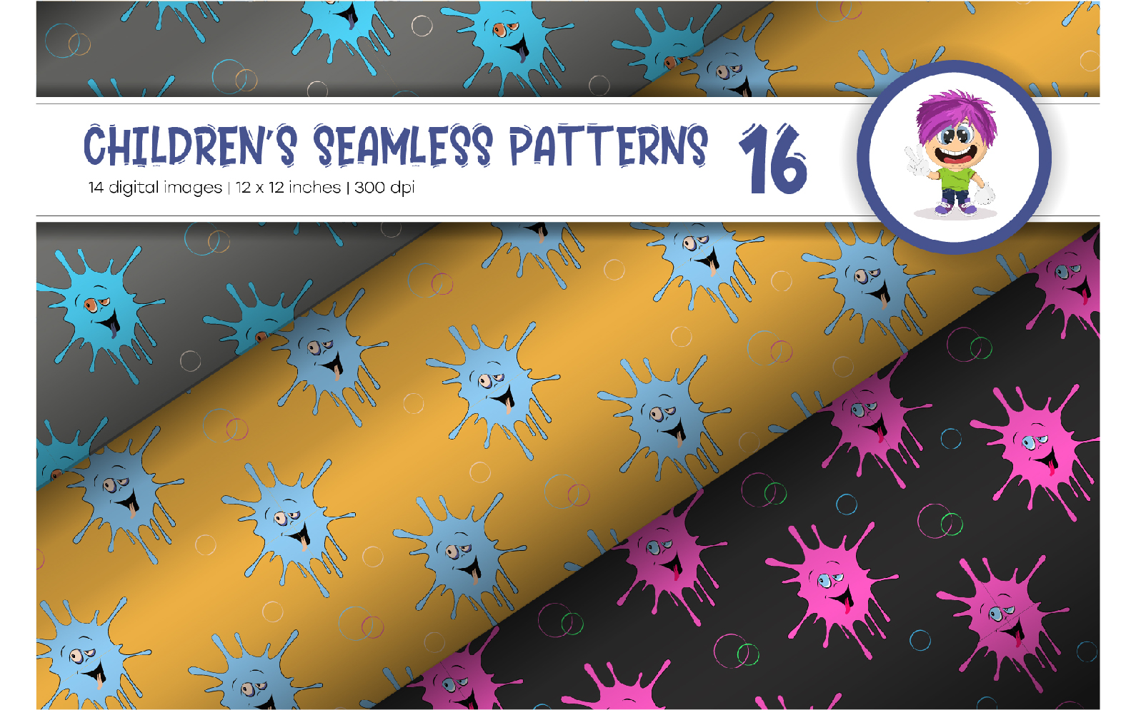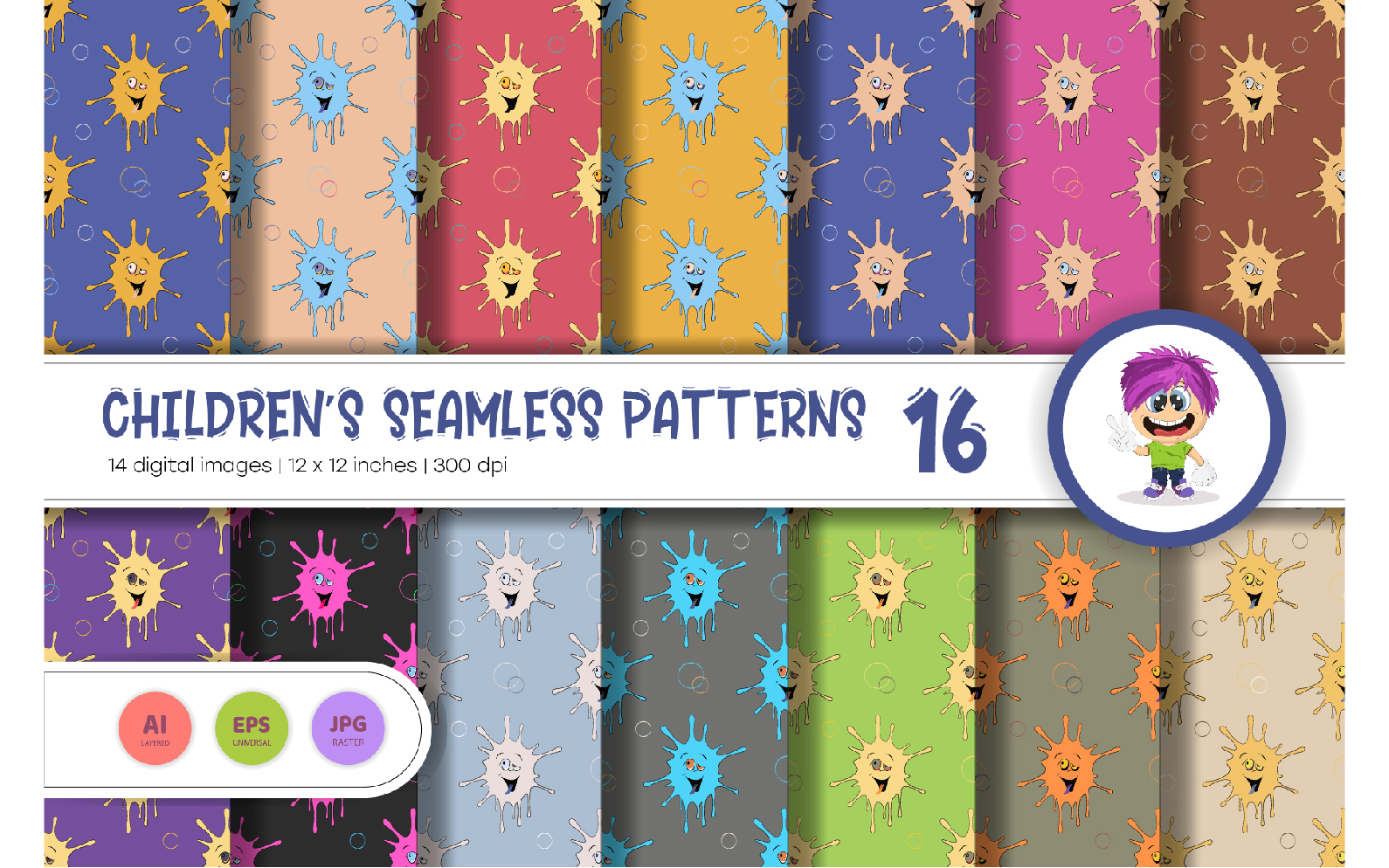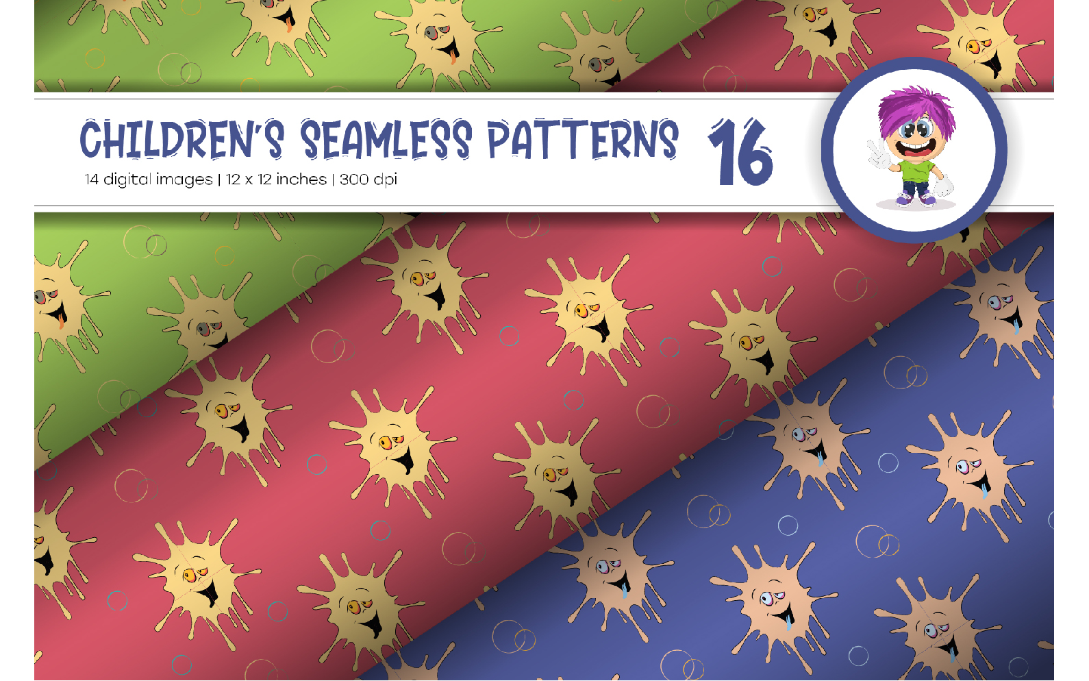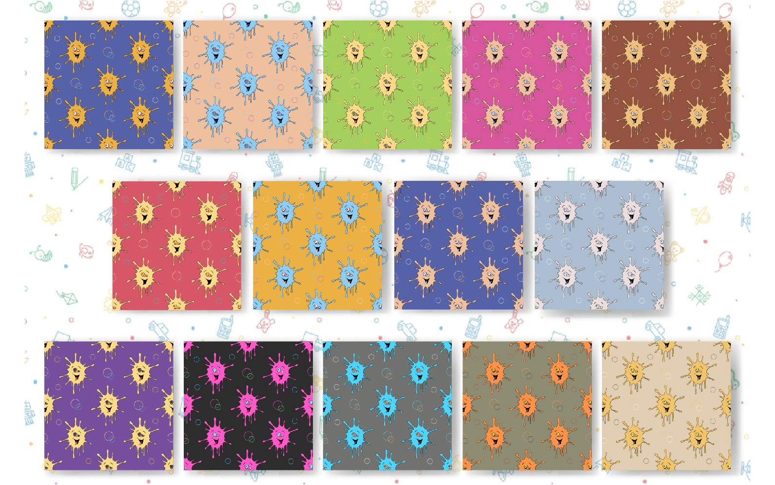 Seamless patterns with colorful cartoon faces. Cartoon doodle. digital paper. This set includes 14 baby seamless patterns in a variety of styles and palettes.