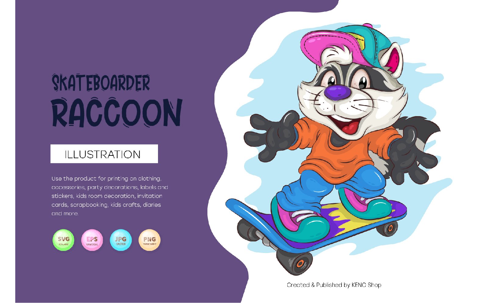 Cute illustration of a cheerful Raccoon on a skateboard. Unique design, Childish illustration. Use the product to print on clothing, accessories, holiday decorations, labels and stickers, nursery decorations, invitation cards, scrapbooking, diaries and more.