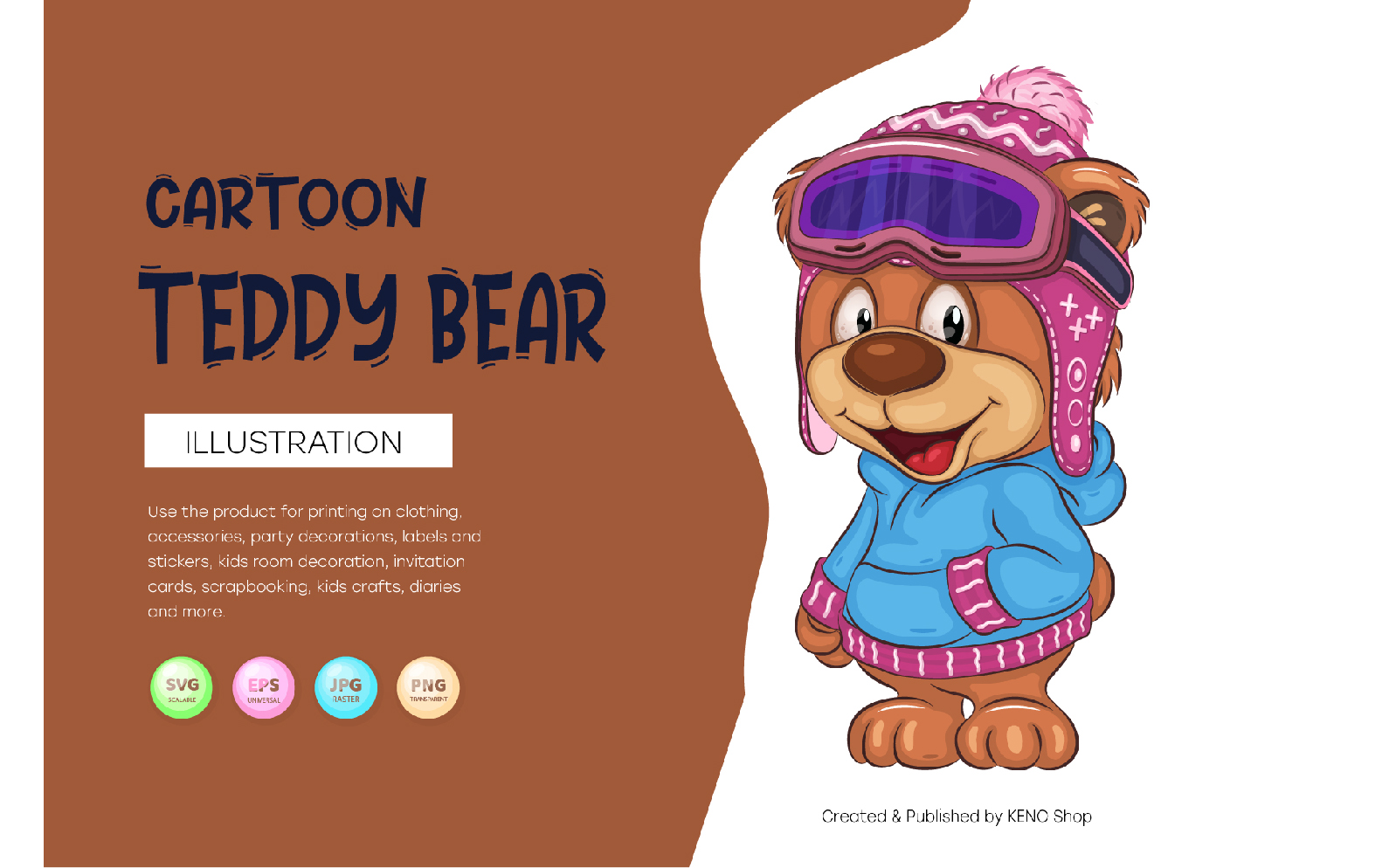 Cute cartoon illustration of a Teddy Bear wearing a winter hat and ski goggles. Unique design, Children's illustration. Use the product for printing on clothing, accessories, party decorations, labels and stickers, kids room decoration, invitation cards, scrapbooking, kids crafts, diaries and more.