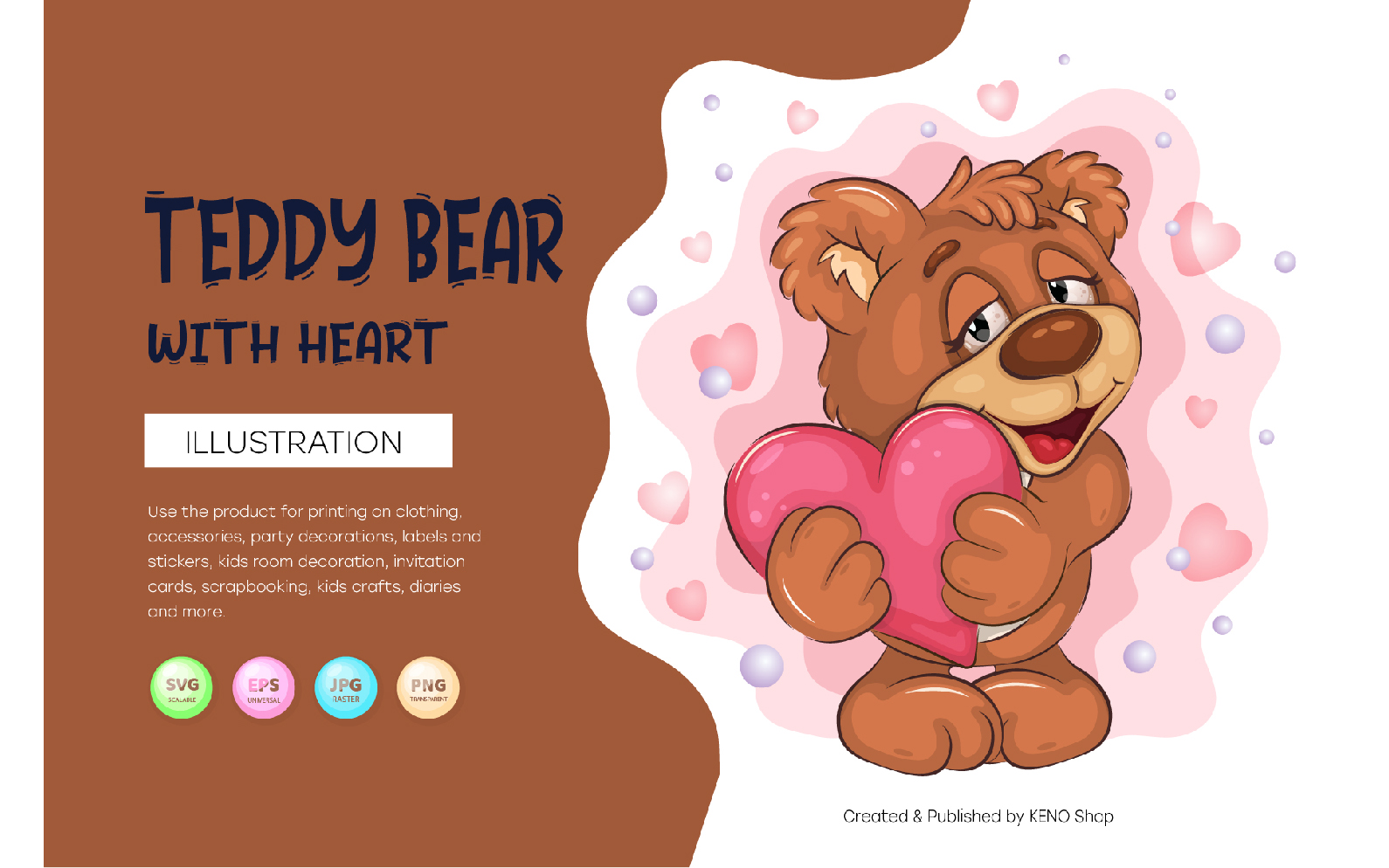 Cute illustration of Teddy Bear holding a heart in its paws. Clipart for Valentine's Day. Unique design, Children's illustration. Use the product for printing on clothing, accessories, party decorations, labels and stickers, kids room decoration, invitation cards, scrapbooking, kids crafts, diaries and more.