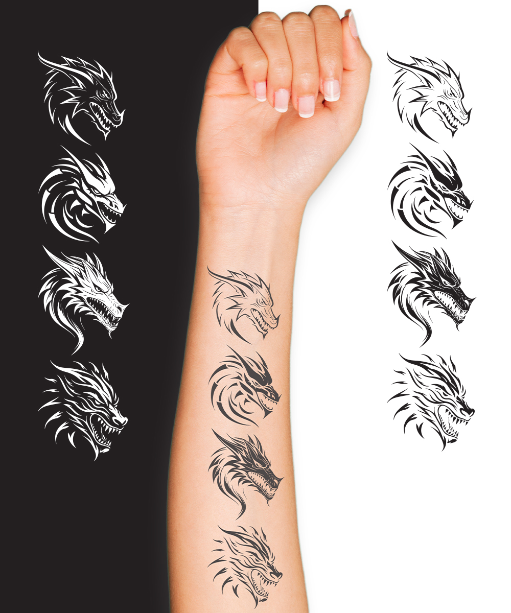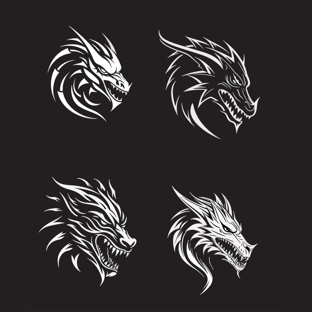 This unique collection features four fierce, tribal-style dragon head illustrations, each with intricate linework and bold detailing. Perfect for use in tattoo designs, logo creation, or fantasy-themed graphic projects, these dragons showcase a variety of styles from aggressive to mystical. Each design is meticulously crafted for high-quality printing or digital projects, making it versatile for creative applications. Ideal for those looking for powerful mythical creatures in their artwork!