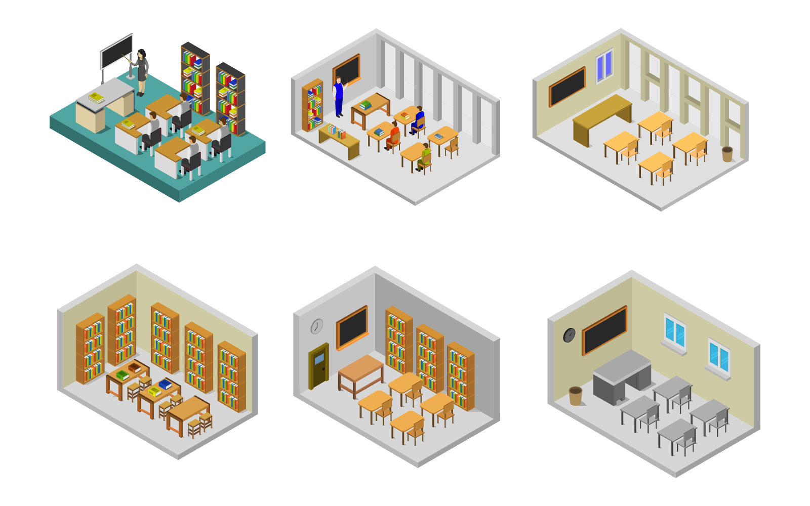 detailed and high quality isometric school room, colored and illustrated in vector on a white background divided into the various vector paths and in EPS format available for Adobe Illustrator and usable for any support and graphic use ready for immediate use for your graphic projects