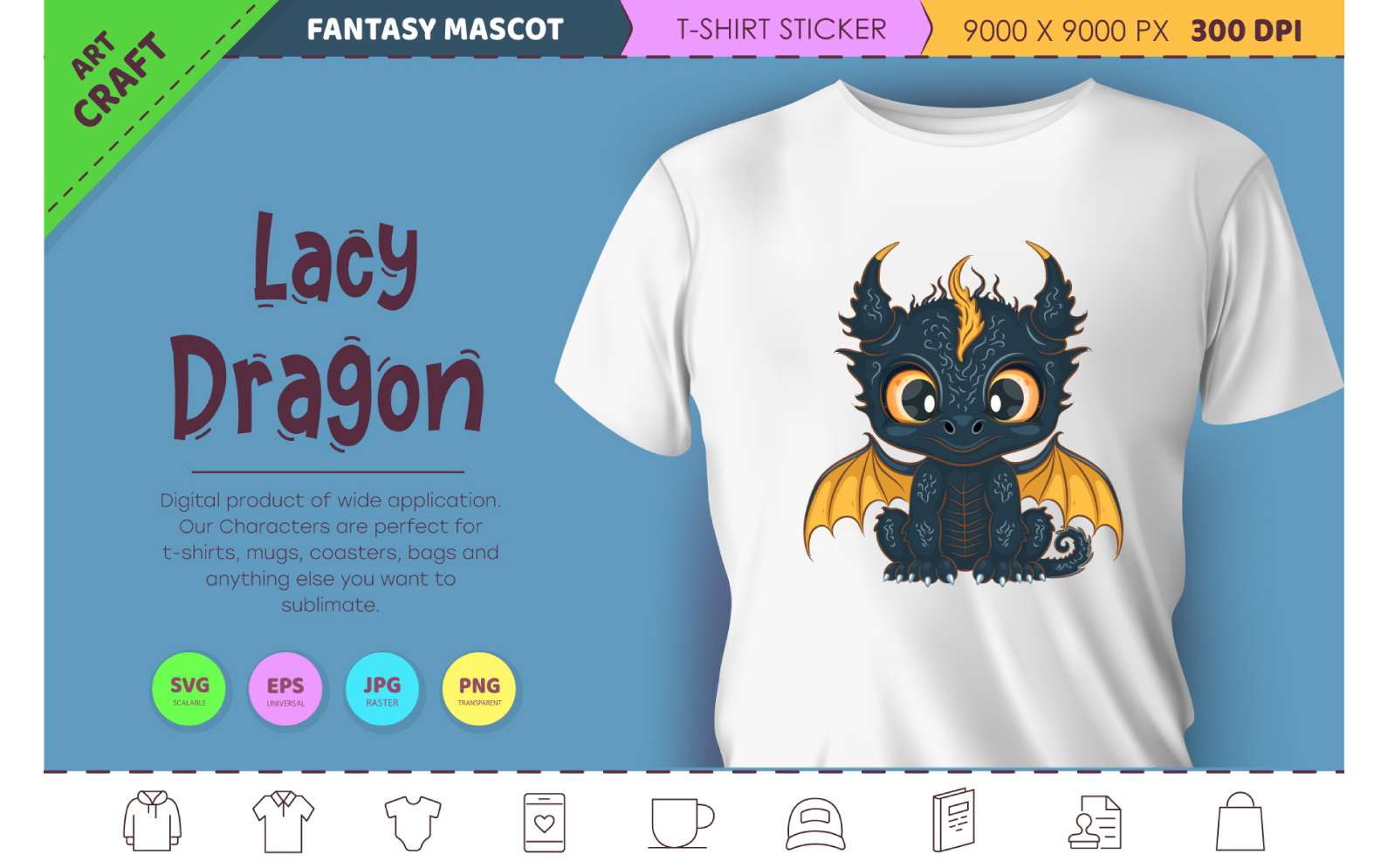 Cute cartoon illustration of sitting Lacy baby dragon. Unique design, fantasy mascot.