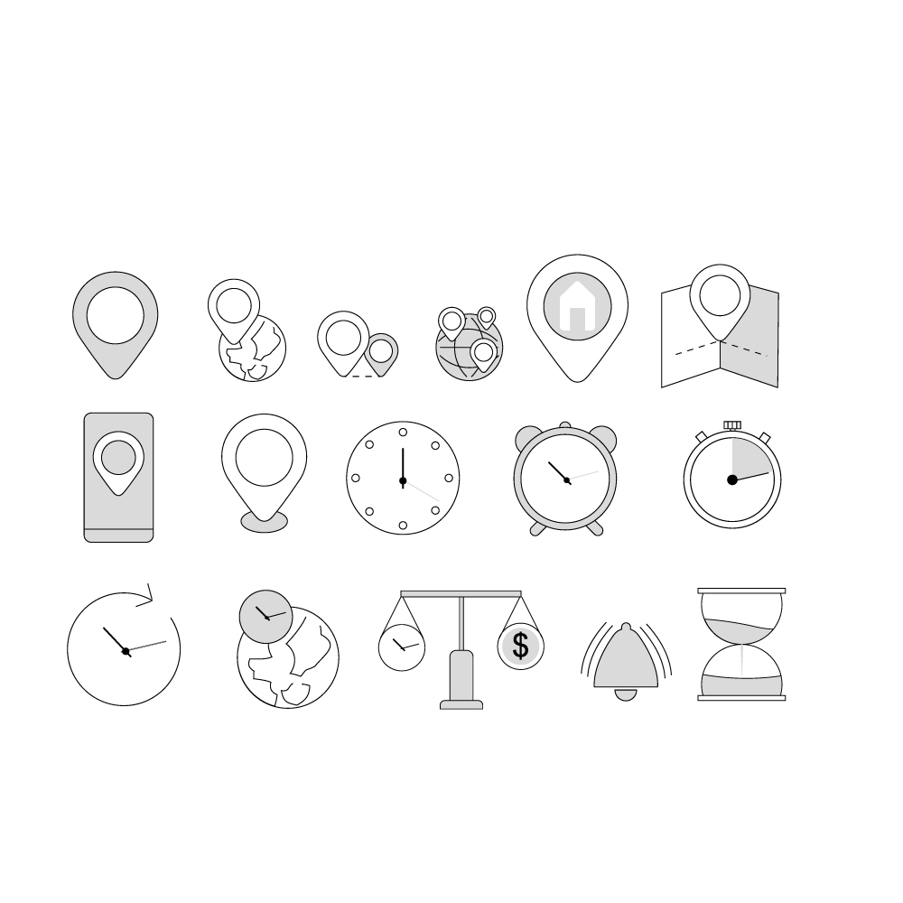 Line icons about location, time and date. Contains such icons as clock, schedule and pin.