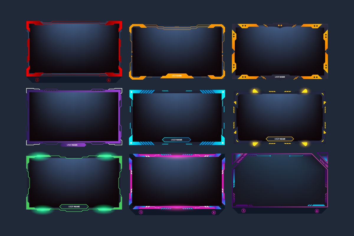 Live game screen panel template set. Futuristic gaming overlay and online screen panel bundle with red, yellow, and purple colors. Live streaming overlay collection with abstract shapes. Modern gaming overlay set vector.