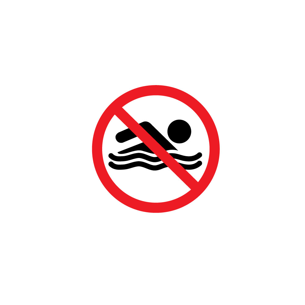 This striking "No Swimming" vector icon features a clear prohibition circle over a swimmer, making it ideal for beach signs, pool safety guidelines, and hazard warnings.