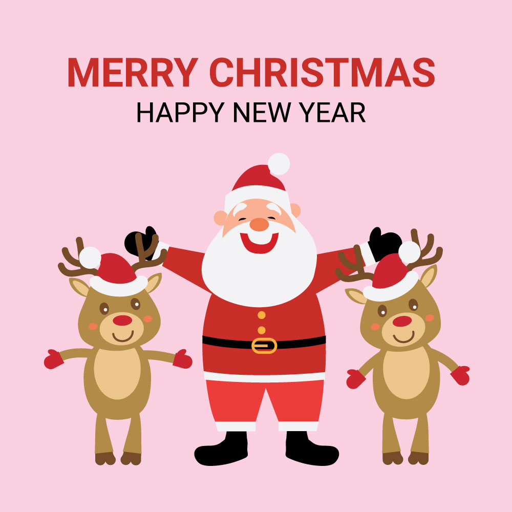 This charming Christmas illustration features a cheerful Santa Claus and two smiling reindeer in a delightful cartoon style.