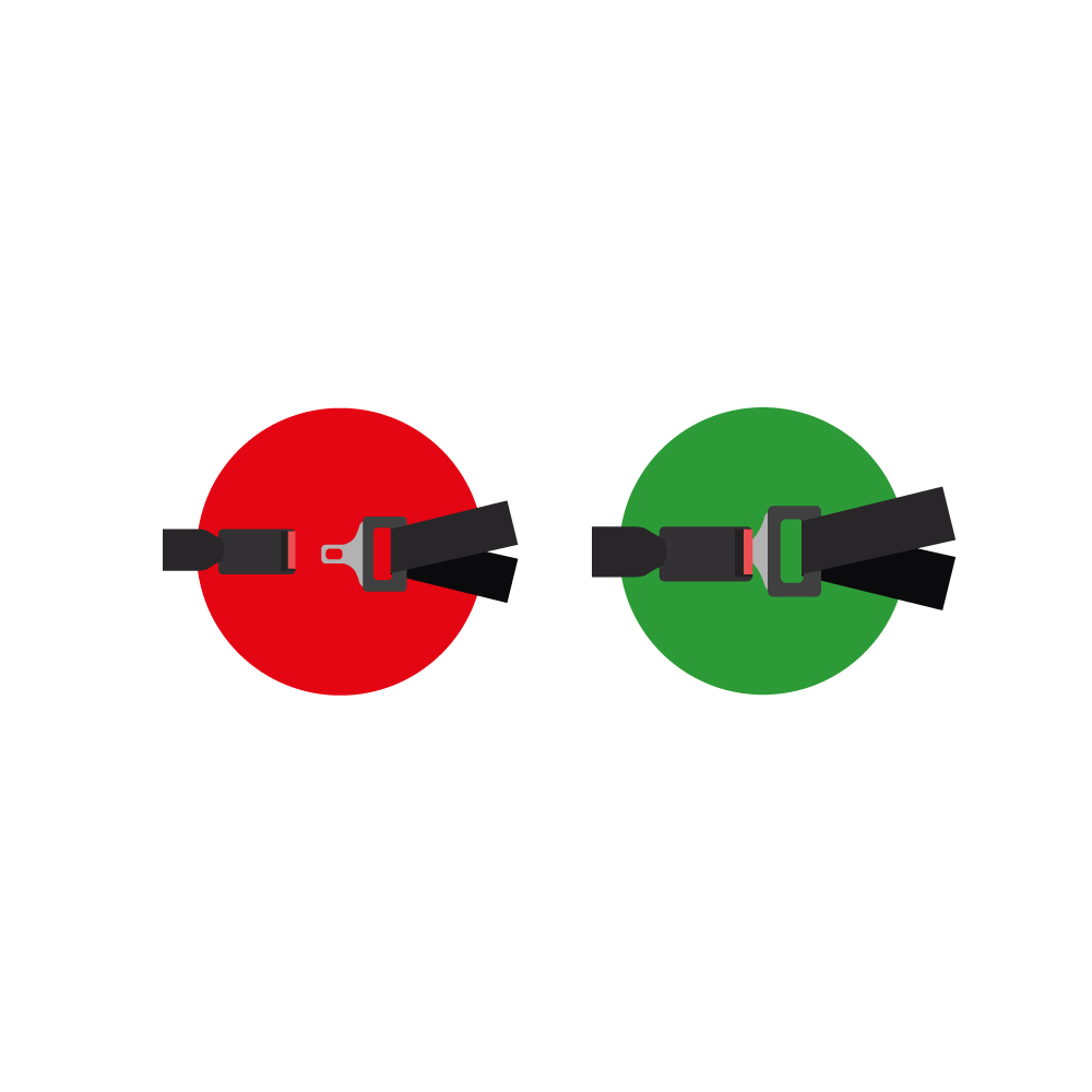 High-contrast vector illustration showing open (red) and closed (green) seat belts with bold safety warnings.