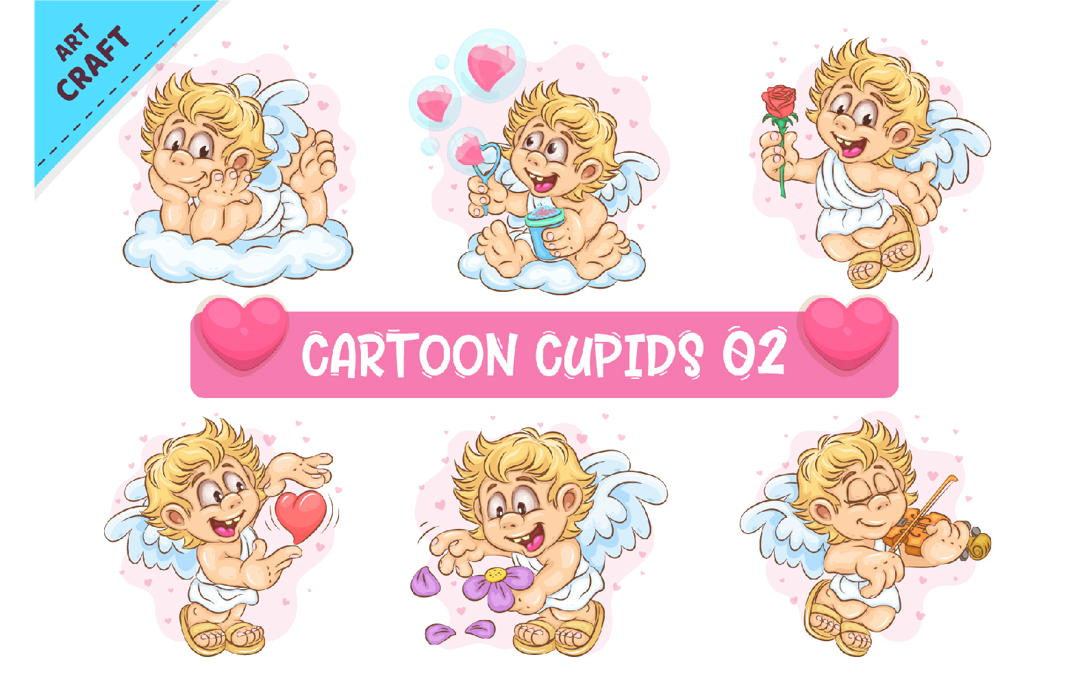 Bundle of cute cartoon illustrations of Cupid, for Valentine's Day, part 02, 6 pieces in total. Cartoon mascot for Valentine's Day.