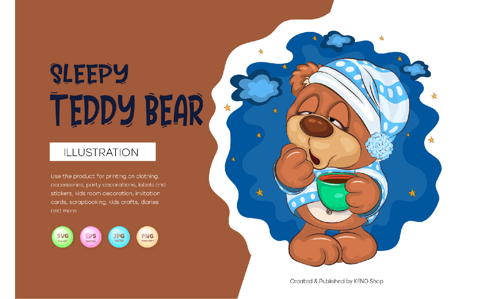 Cute illustration of a sleepy Teddy Bear. Teddy bear with a cup, yawns. Unique design, Children's illustration. Use the product for printing on clothing, accessories, party decorations, labels and stickers, kids room decoration, invitation cards, scrapbooking, kids crafts, diaries and more.