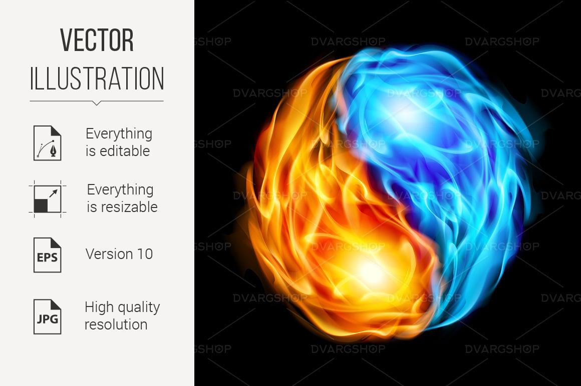 Symbol of yin and yang of the black background in the form of red and blue fire