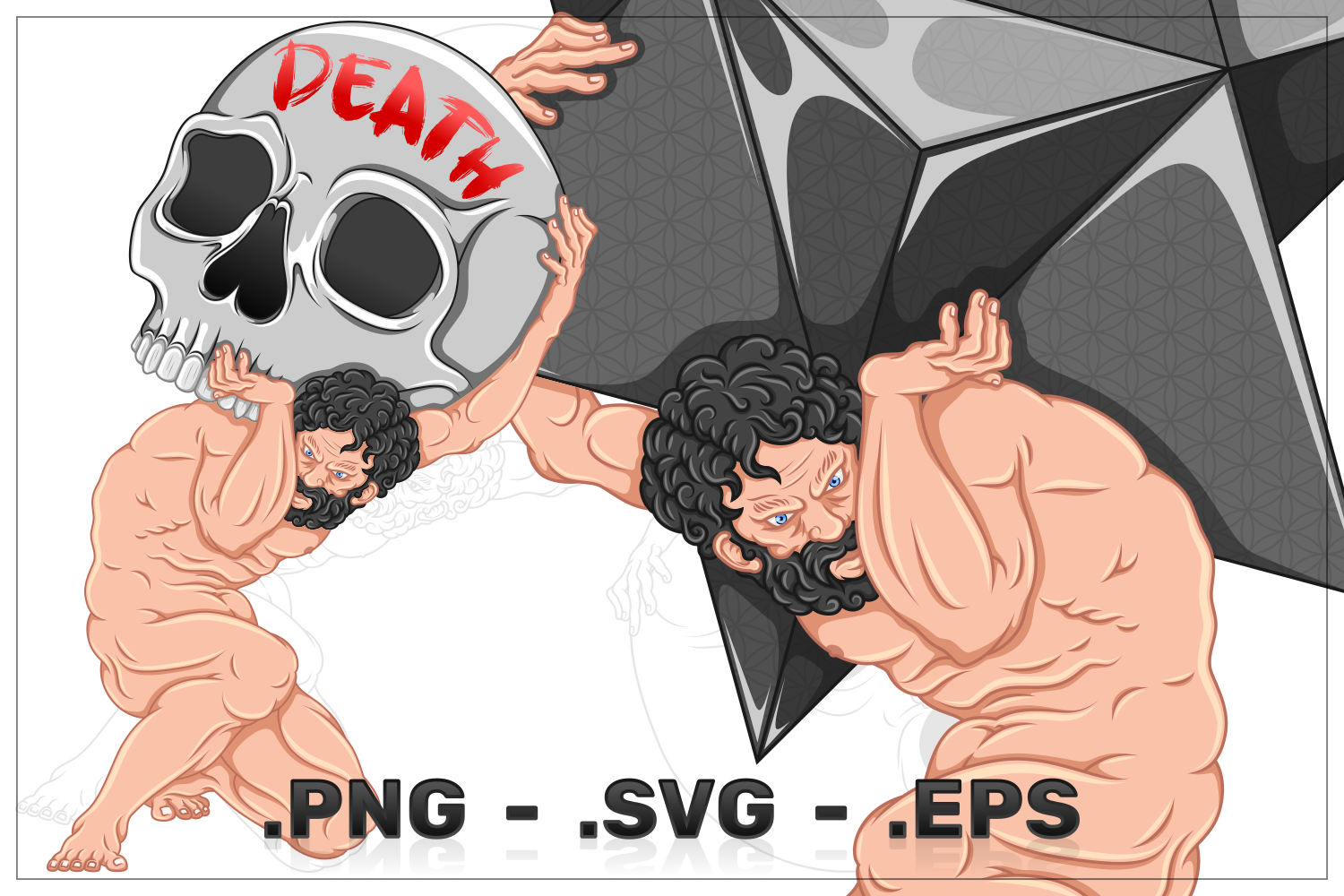 Vector design of the Titan Atlas holding a Halloween skull. The Titan from Greek mythology with a merkaba and the Metatron symbol.