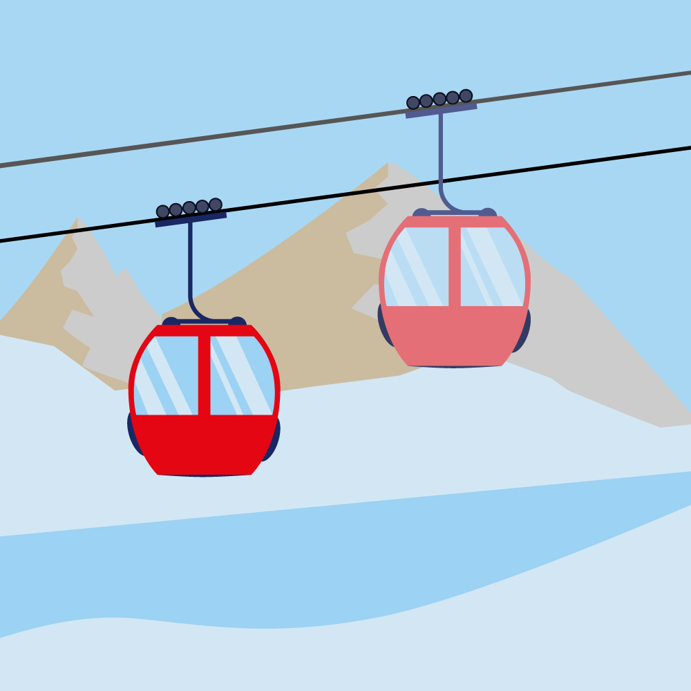 This detailed illustration captures a serene winter mountain landscape with two cable cars transporting skiers across snow-covered peaks.