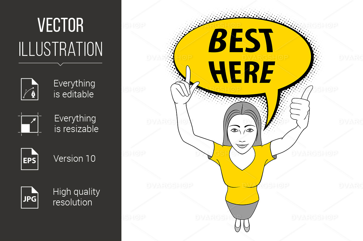 Cartoon Illustration of a Young Woman Giving a Thumbs Up. Best Here
