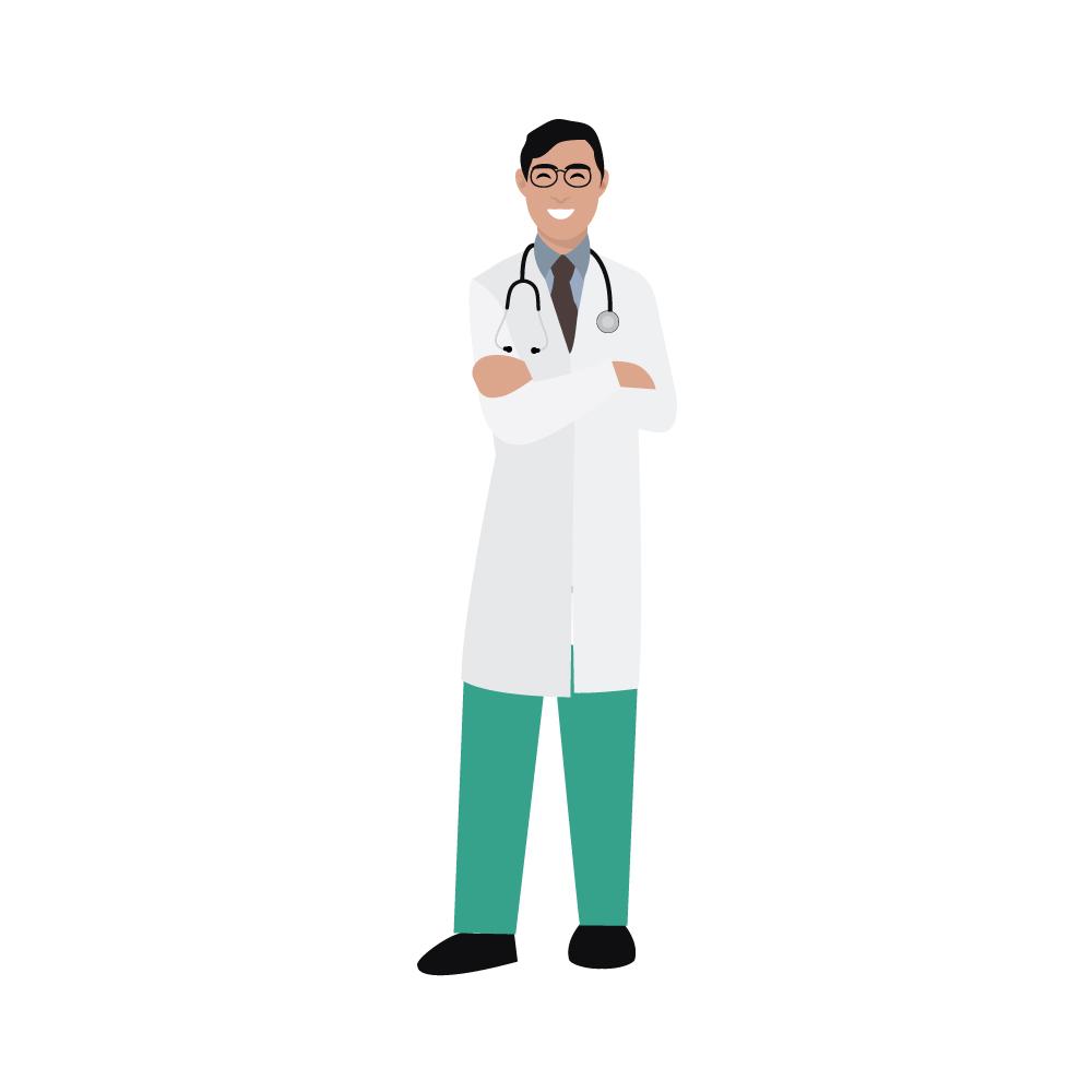 Flat vector illustration of confident young doctors in white medical coats standing with arms folded.