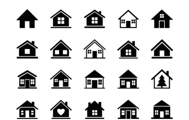 A diverse collection of 25 minimalist black house icons and home symbols on white background
