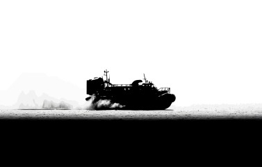 Military landing craft navigating rough seas with powerful wake isolated on white background