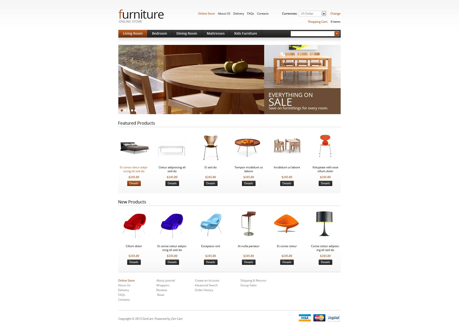 Clean minimalistic approach has been applied to this design. The elements are placed over simple fair background. Soft brown colors used in the layout are associated with natural wooden materials. Animation effects on slider images flip mildly draw visitor's attention. Content area includes two sections, where products stand in six columns and zoom in on hovering.