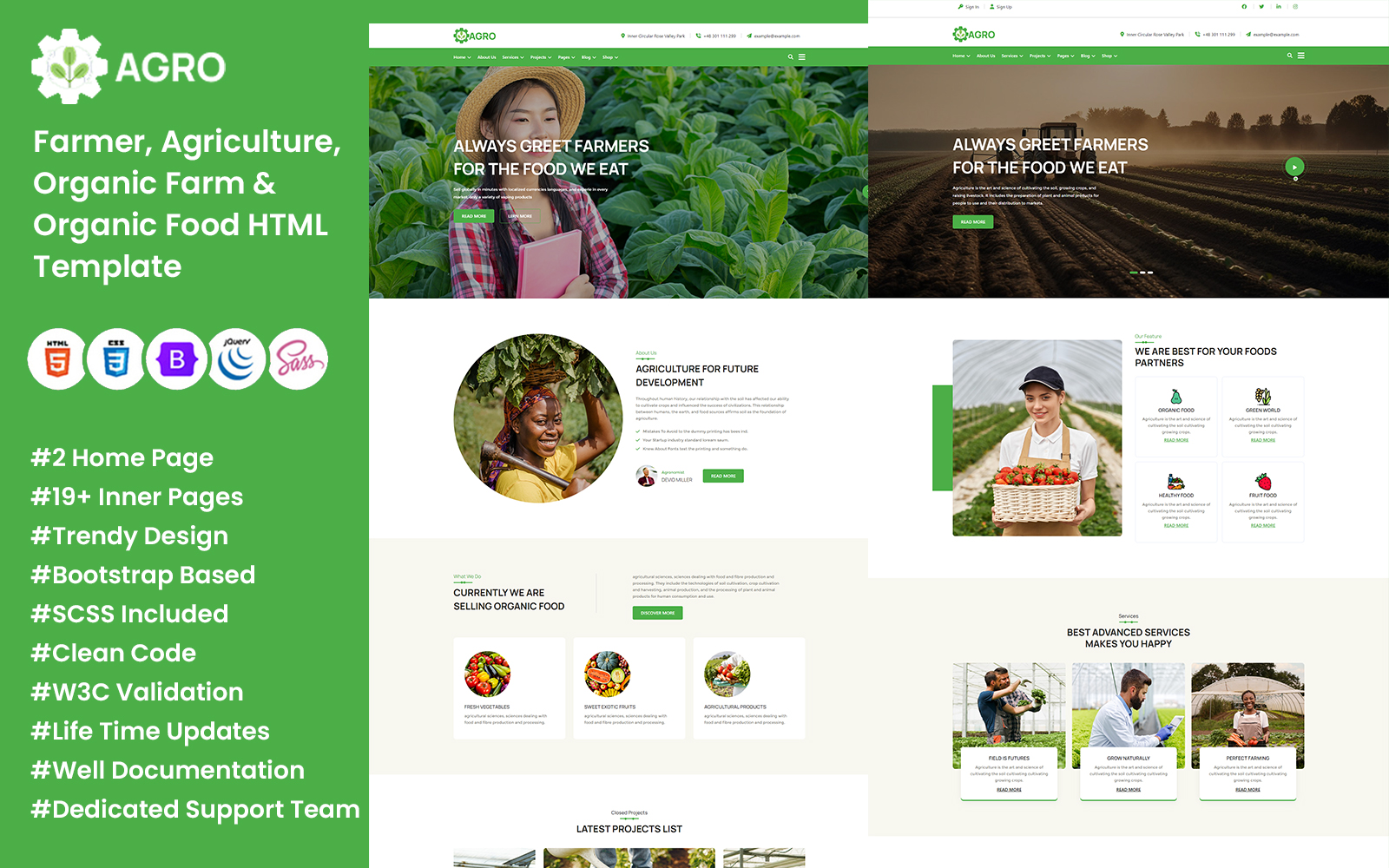 Unleash the full potential of your farming and agriculture endeavors with Agro - the ultimate HTML template tailor-made for the agriculture and organic food industry. Featuring two captivating home page variations and an impressive selection of 19+ inner pages, Agro is your all-in-one solution for crafting a remarkable online presence in the world of farming and organic produce.