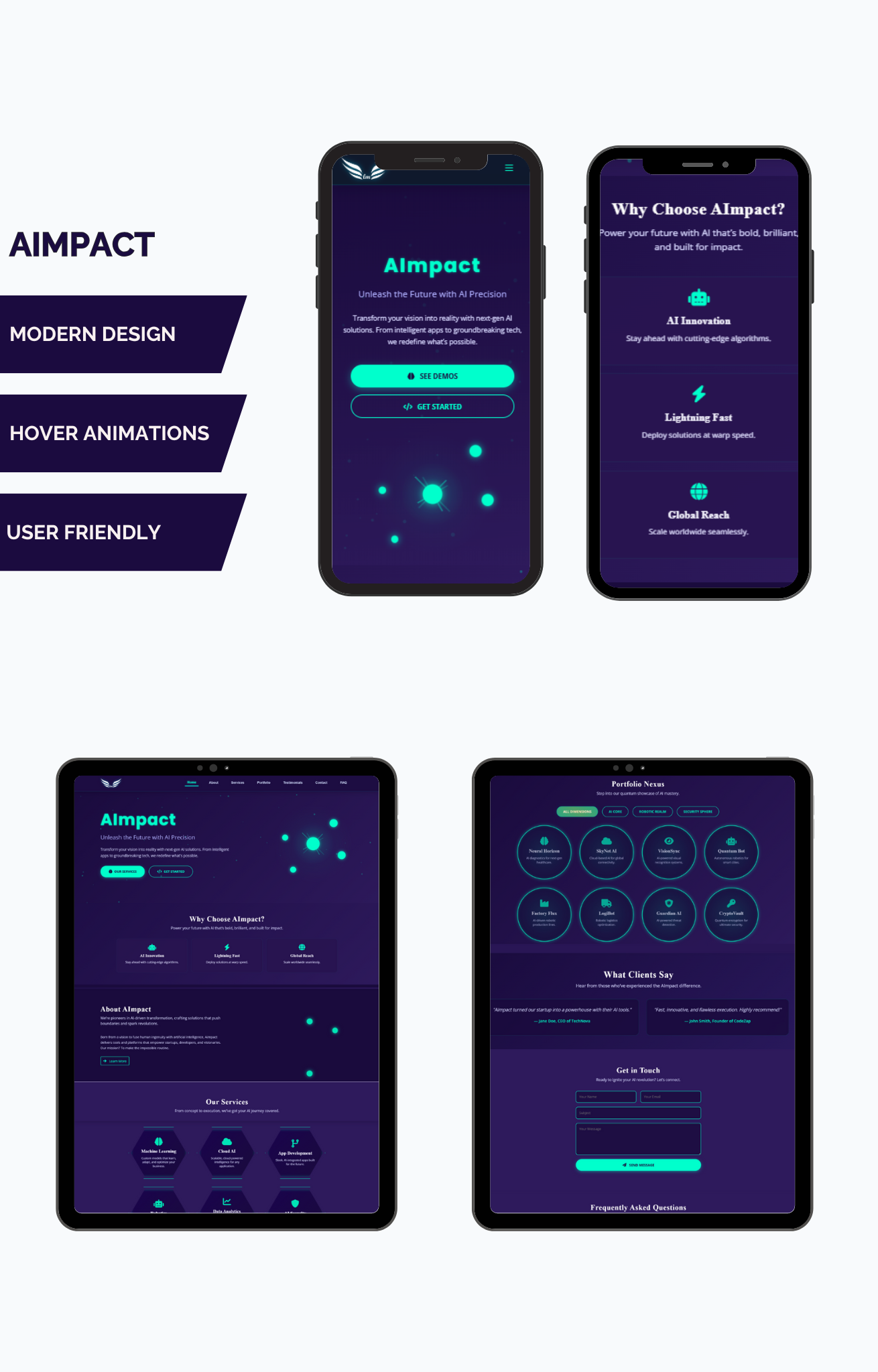 In today’s fast-paced digital world, standing out online is essential. AImpact gives you the tools to impress with seamless navigation, eye-catching visuals, and flawless performance—on any device. It's the perfect platform to engage clients, attract partners, and present your work with clarity and style.