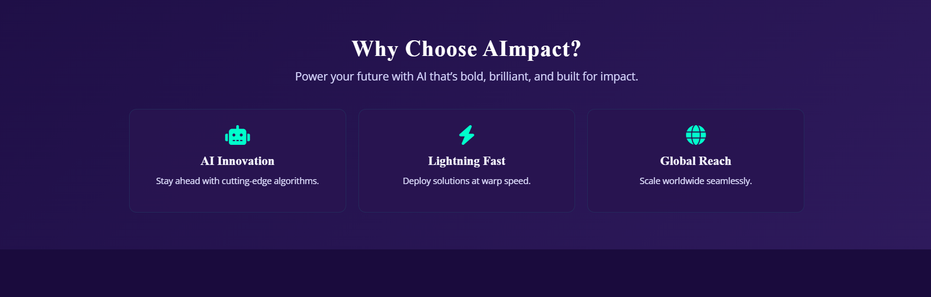 Elevate your business or creative venture with the AImpact Template—a versatile and professional website solution designed for startups, developers, agencies, and forward-thinking companies across industries. Whether you're launching a new product, showcasing innovative services, or building a strong digital presence, AImpact delivers a sleek, modern platform that brings your ideas to life.