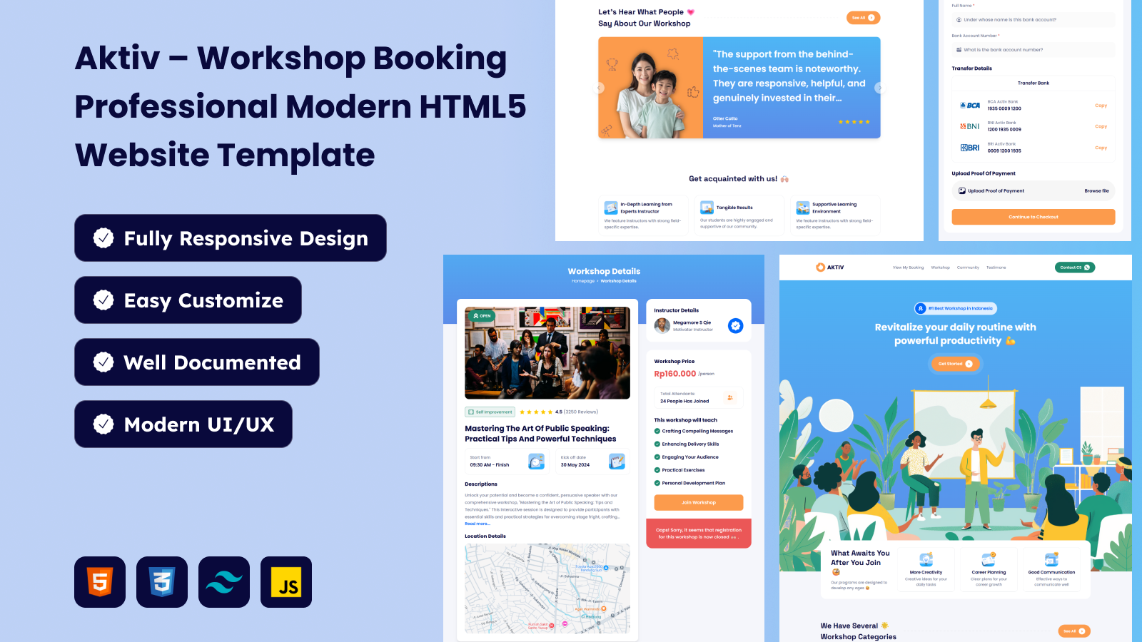 Aktiv is a premium HTML template for online workshop and training platforms. Built with Tailwind CSS and vanilla JavaScript, this responsive template includes 8 complete pages covering the entire workshop booking flow. Features workshop browsing, detailed booking forms, payment processing UI, user dashboard, and mobile-optimized design. Perfect for educational institutions, training companies, skill development platforms, and online course providers. No backend included - frontend template only requiring integration with your preferred backend solution.