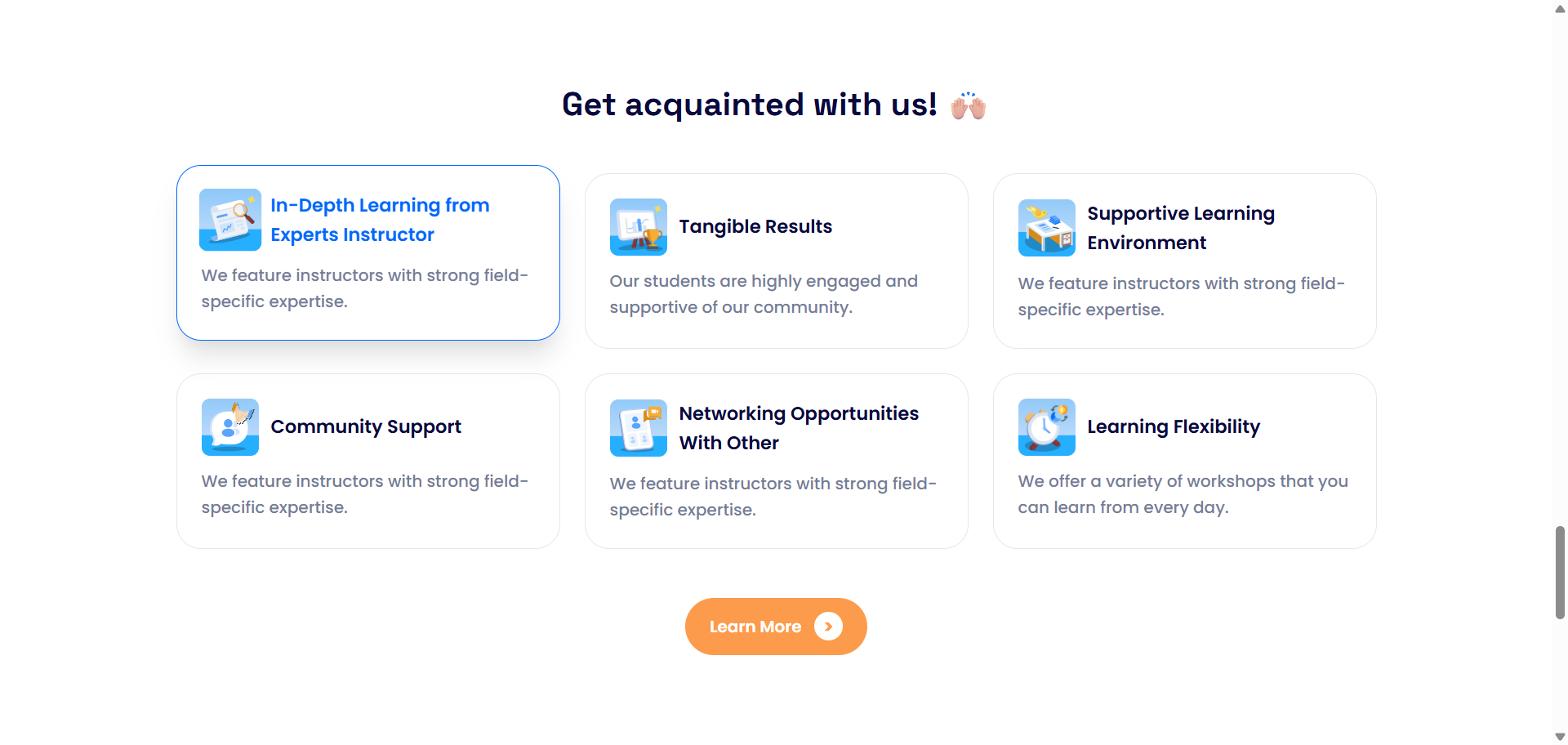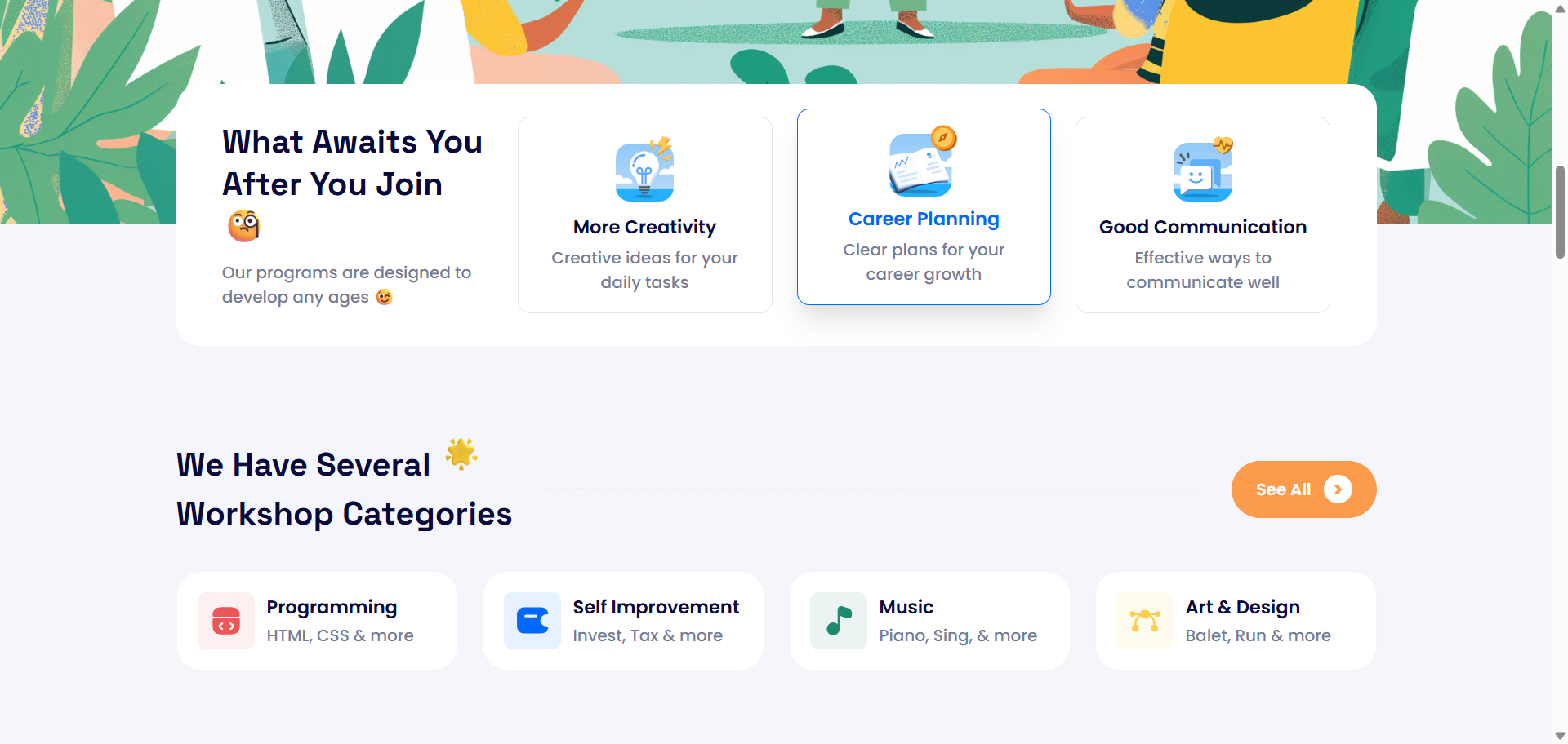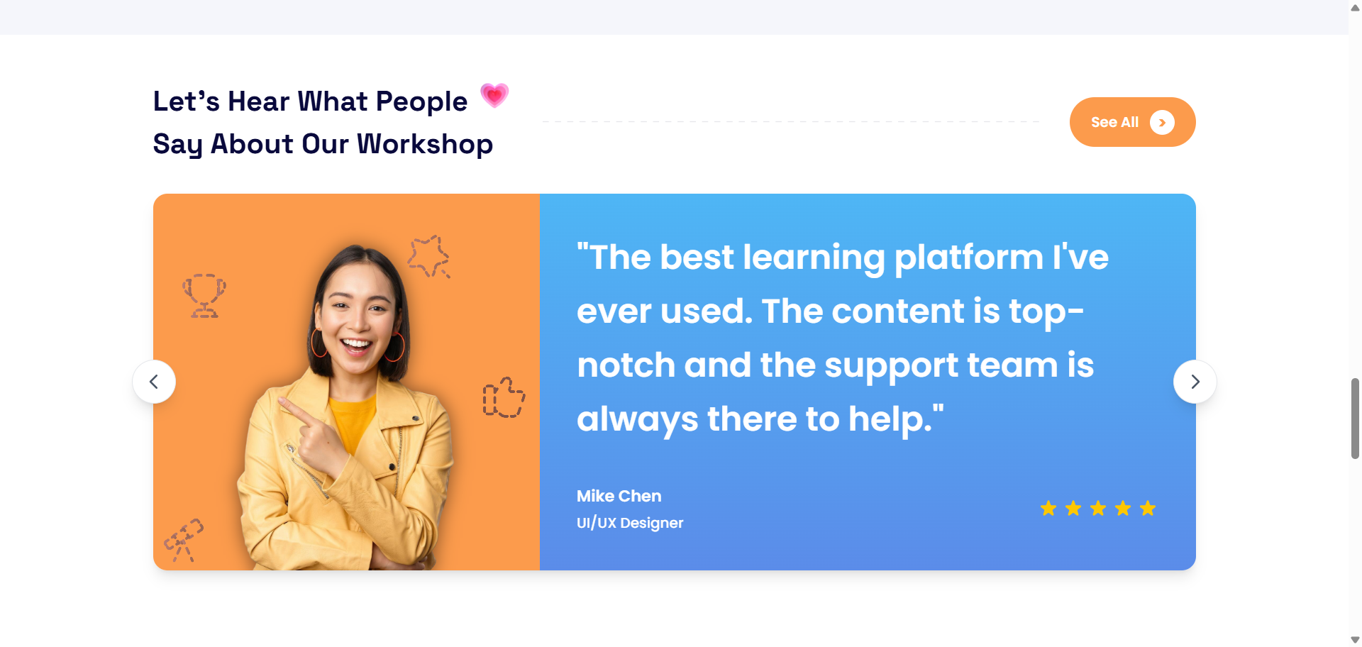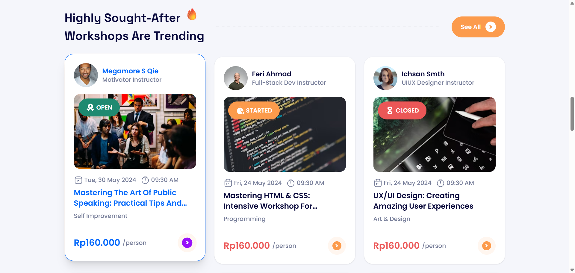 - Landing Page - Hero section, workshop categories, featured workshops, testimonials