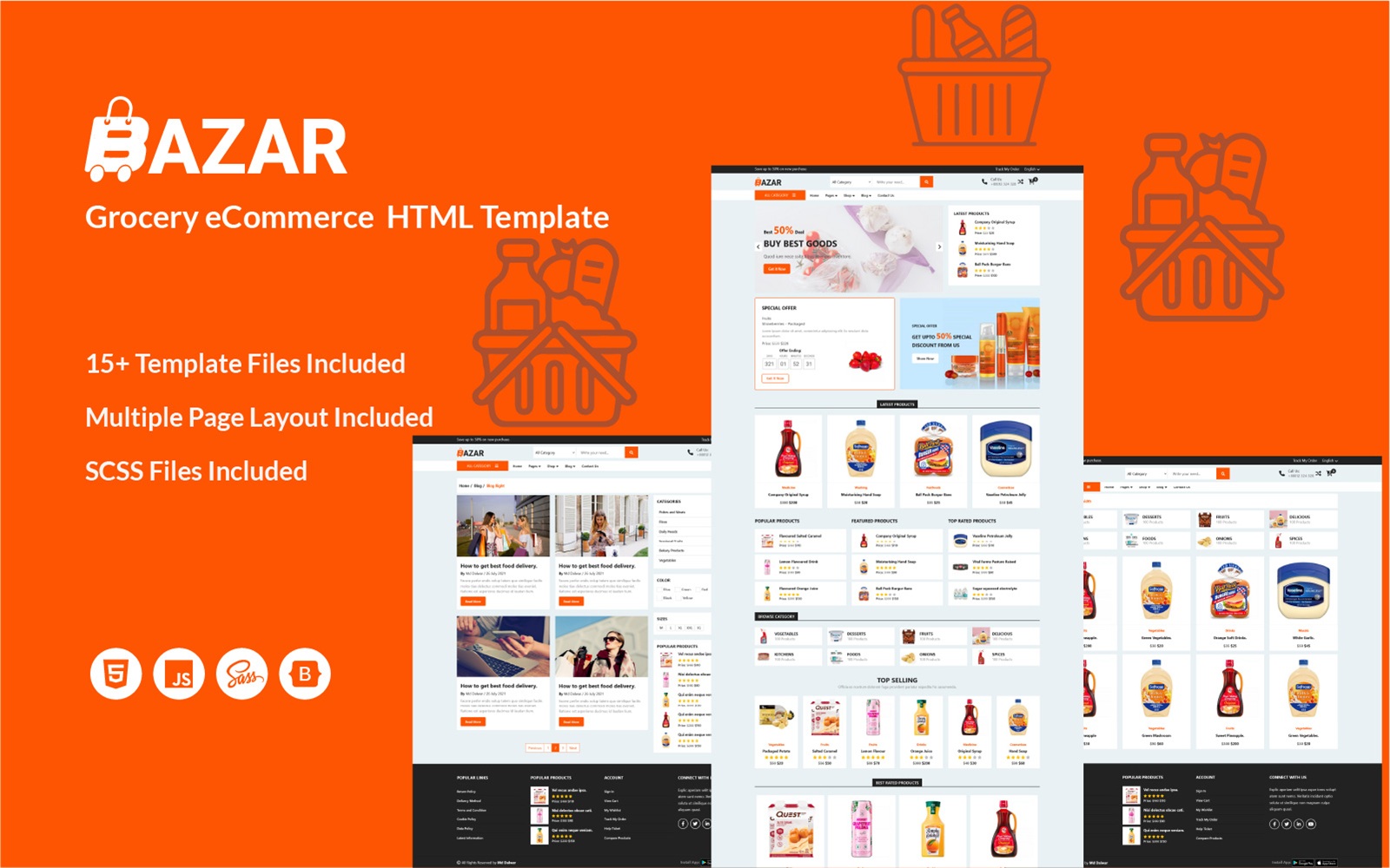 Bazar - Grocery eCommerce HTML template. If you want to create any type of ecommerce website Bazar will be your perfect choice. We provide required pages layout for your website. Also, you can be convert this template to Woocommerce Template. Because of that, it has all Woocommerce layout included. You can avoid expensive web development and minimize your design costs using Bazar eCommerce HTML template.