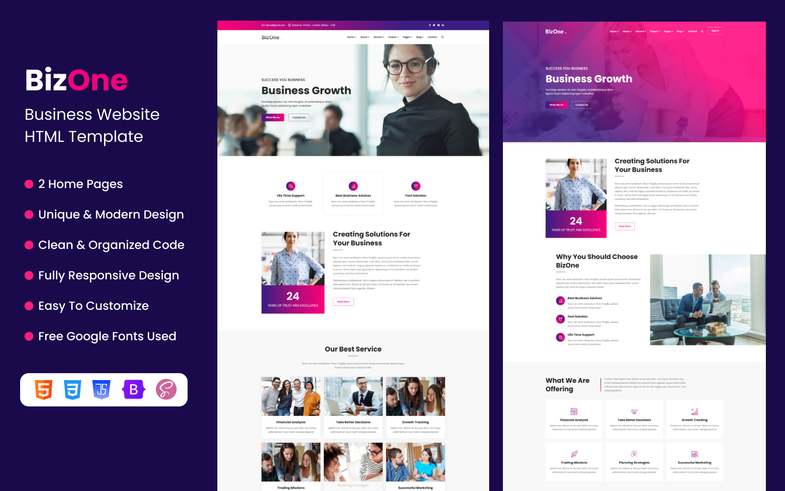 BizOne is a modern, sleek, and fully responsive HTML template designed to elevate your business’s online presence. Built with Bootstrap 5, this template ensures seamless adaptability across all devices—from desktops to smartphones—providing an optimal viewing experience for your visitors. With 19 meticulously organized HTML pages, each file is logically named and structured for effortless customization, allowing you to tailor the design to your brand’s unique identity without any hassle.