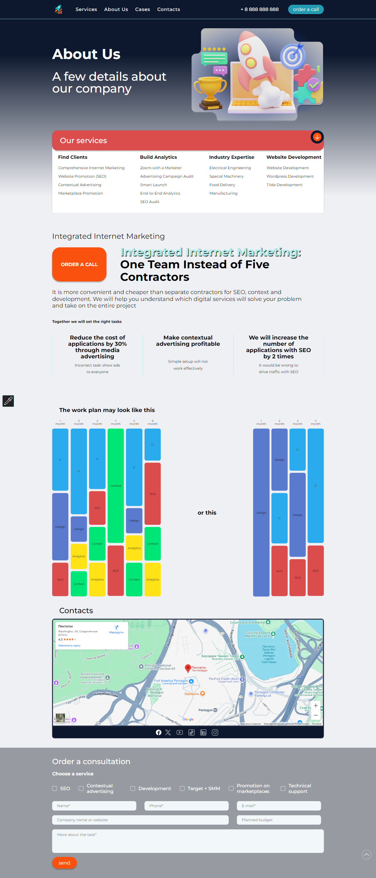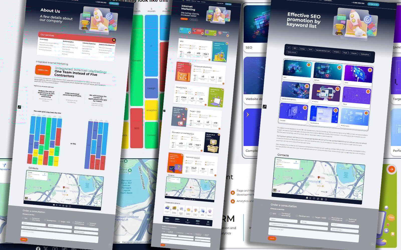 The template is designed specifically for IT companies that develop and promote websites. The design is designed in a combination of light and dark colors. The site has several pages that complement each other. Let's start with the main page. Site header. In it you can see the site navigation, logo, and a button for submitting a quick application. The next hero section is with a concise page tagline. Next is a slider with the main services on the site. Clicking on any block will take you to the corresponding section. Also on the main page there is a contacts section, with a Google map and links to social networks, a section with the work process, and a form for submitting an application. The next page of the site is "About Us". On it you can immediately see a wider list of services that the company will provide. The next section will show your benefits in more detail and encourage the customer. The next very beautiful section shows the stages of work, their volumes and variations. Next is a page with examples of your work. Sorting has been developed here for more convenient searching. I hope you like it.