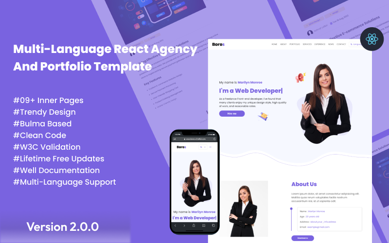 Boros is a new modern responsive React template, built with ReactJS and Bulma. It offers multi-niche portfolio demos for various purposes including Creative Agency, IT Agency, SEO Marketing Agency, Videography Agency, Business Agency, Software Startup, Digital Marketing, Business Consulting, Freelancer Portfolio, App Showcase, Personal Portfolio, Cyber Security Agency, IT Startups, IT Agency, and IT Solutions Company. It is designed to look engaging and attractive on all screens and devices, including Windows, Mac, iOS, Android, etc.