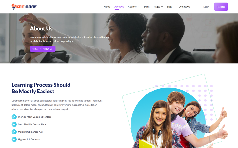 Bright Academy is a modern and fully responsive online academy website template designed for educational institutions, training centers, e-learning platforms, coaching academies, and education consultants. Built with clean design principles and clear navigation, it serves as one of the best education website templates for launching a professional learning platform quickly and effectively.