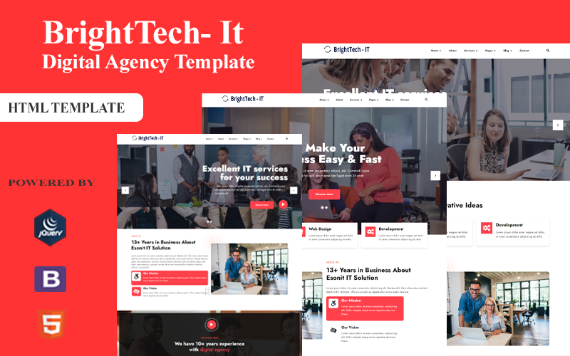 Brighttech-IT is a Creative Agency HTML Template. This Template is suitable for Creative Agency, Business, web designer, software. Brighttech-IT HTML built with Bootstrap 5.x and CSS3 and clean HTML code. The template has 03 home page demo variations and 15+ inner pages. This template is easy to customize and 100% fully responsive.