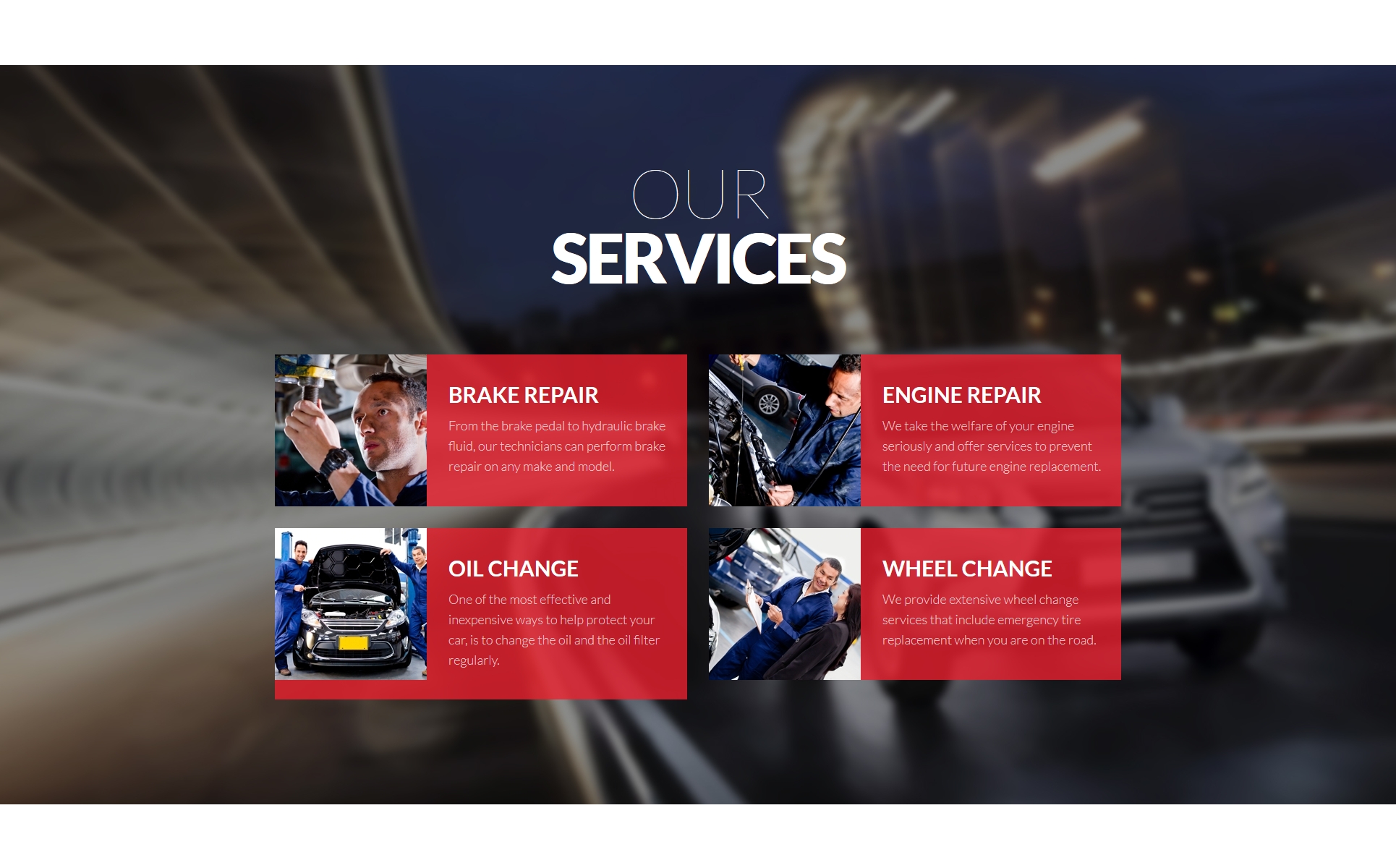 This auto repair service website template was created by our team of talented designers and web developers. Its main goal is to meet the requirements of modern car repair businesses. The template can boast of a variety of pages. For example, you can use the Services page to tell more about your current offers. Also, you can connect with your customers through the Contacts page. Don't forget that you can use various features supplied with Car Repair HTML5 template, such as: