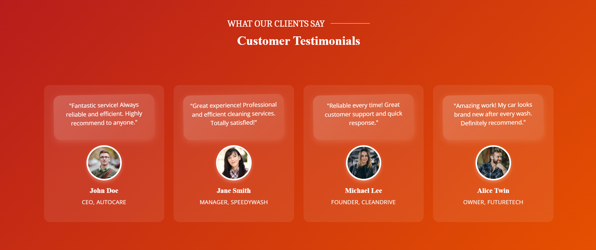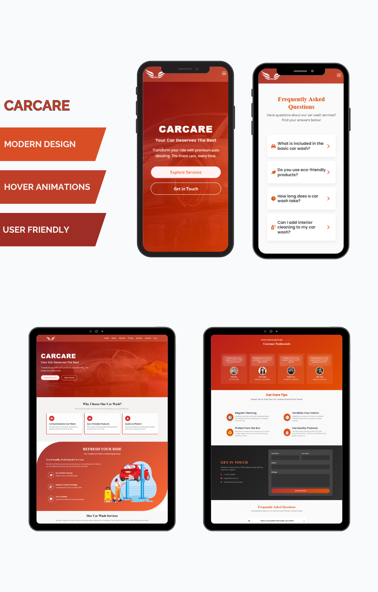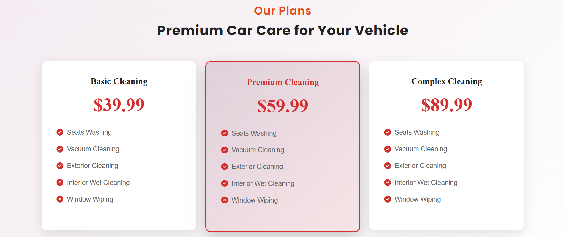 Service Display: Showcase your car wash services in detail with visually appealing service cards, making it easy for customers to understand what’s offered and the benefits of each service.