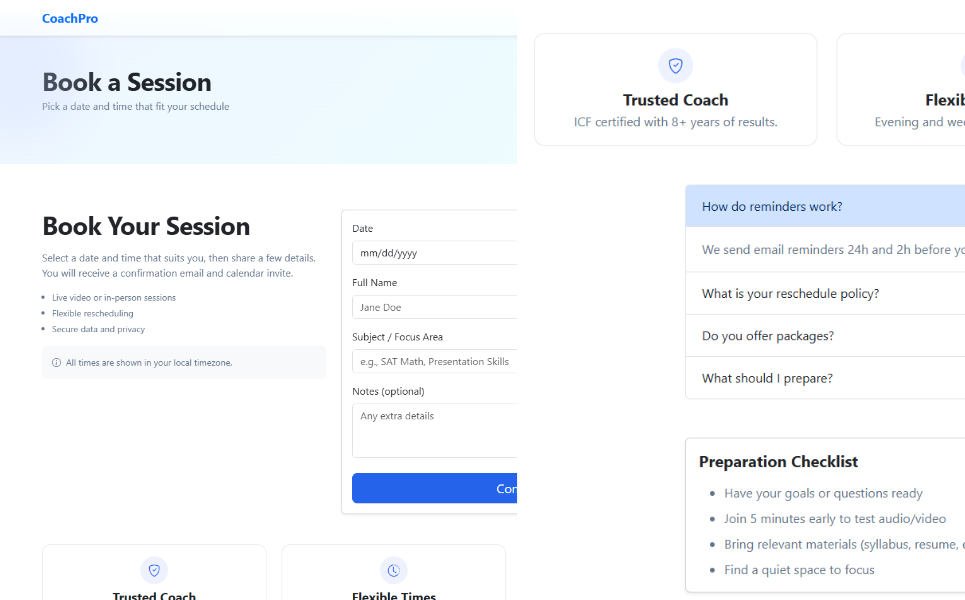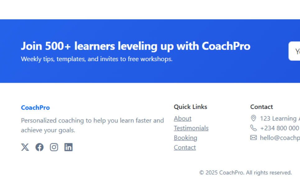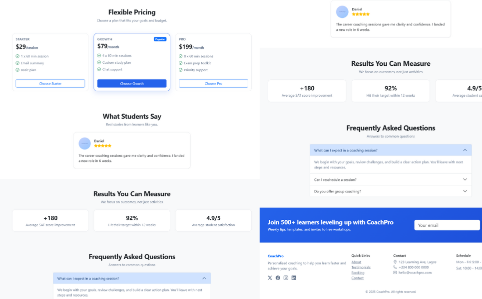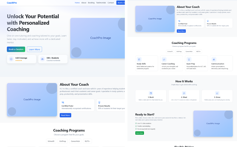 CoachPro is a premium HTML5 and Bootstrap 5 template crafted for business coaches, life mentors, consultants, and corporate trainers who want to establish a strong online presence. With its modern design and responsive layout, this coaching website template delivers a professional user experience across all devices. Perfect for personal coaching, consulting firms, training programs, or portfolio websites, CoachPro helps showcase services, highlight success stories, and connect with potential clients.