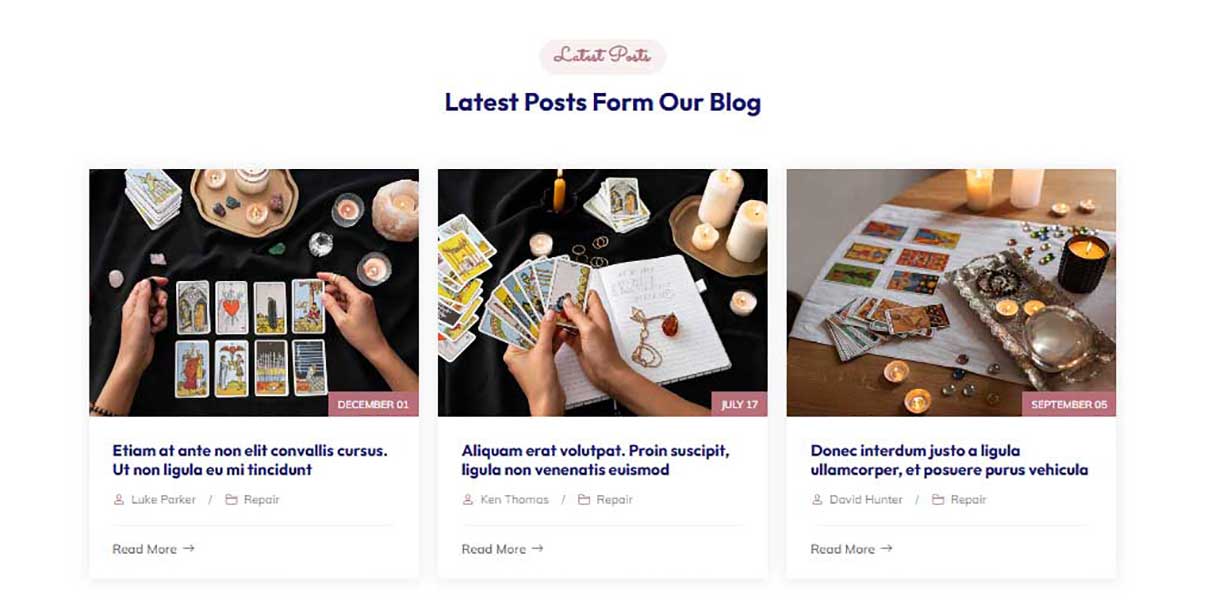 - Blog Section – Share tarot insights, daily readings, and spiritual wisdom