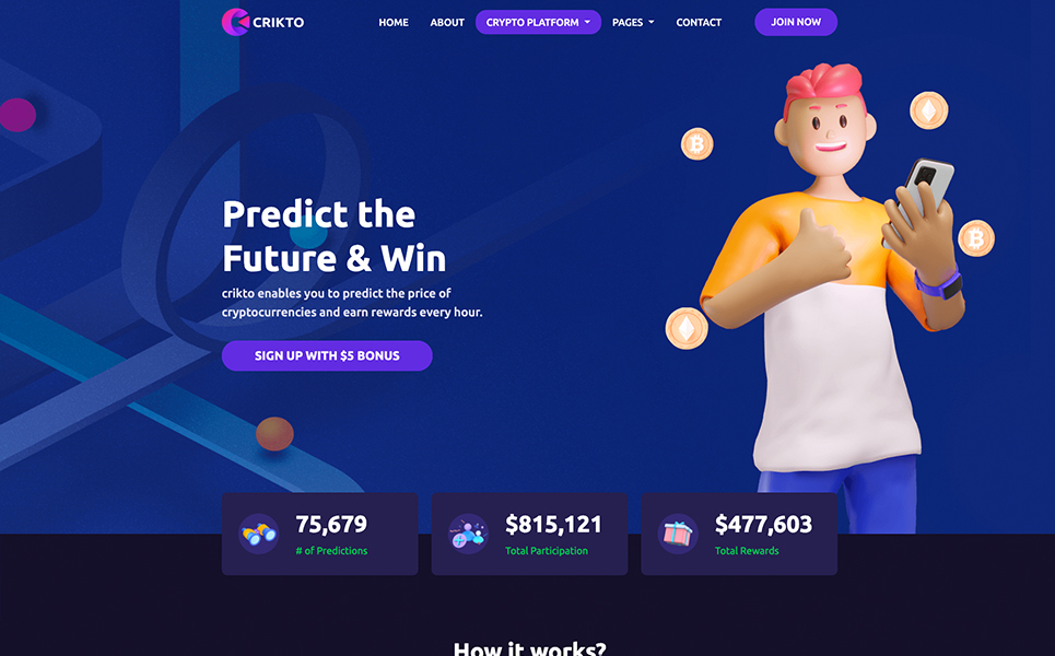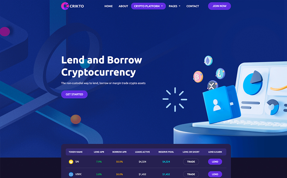 Crikto is an exclusive digital asset marketplace where investors can trade cryptocurrencies, predict cryptocurrency prices and win money, invest in cryptocurrency get interest, and borrow and lend cryptos. Welcome to crikto, the ultimate cryptocurrency trading platform built from scratch with Bootstrap 5 and a modern top-notched web design layout.
