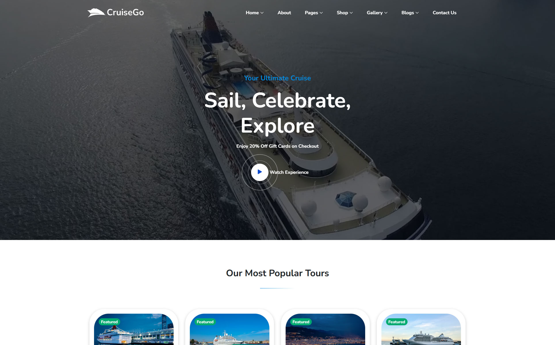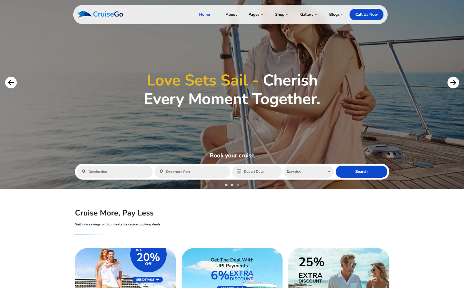 CruiseGo is a premium Cruise Booking website theme designed for travel agencies, tour operators, and luxury cruise organizers who want to create a stunning online presence. Built with modern HTML5 and CSS3, this responsive template combines elegance with functionality, offering a seamless booking experience for cruises, yachts, and luxury voyages.