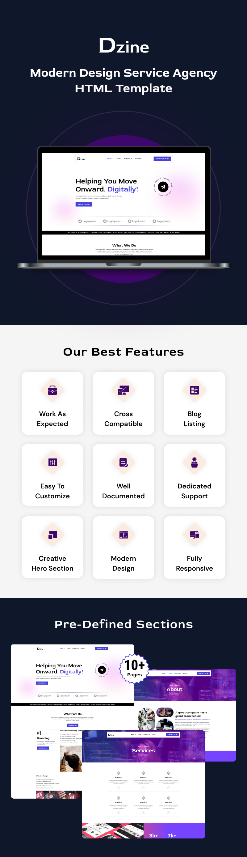 Dzine - Modern Design Agency HTML Template is a creative firm that specializes in crafting innovative visual solutions for brands and businesses. We focus on user-centered design, blending aesthetics with functionality to create impactful experiences across digital and physical platforms. Our services often include branding.