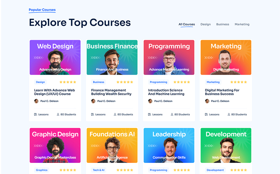 The template features carefully crafted homepage designs for different educational niches such as online courses, business coaching, classic LMS, universities, and kindergartens. Each layout is tailored to highlight the unique requirements of its field, ensuring your educational projects are presented in a modern, engaging, and impactful way.