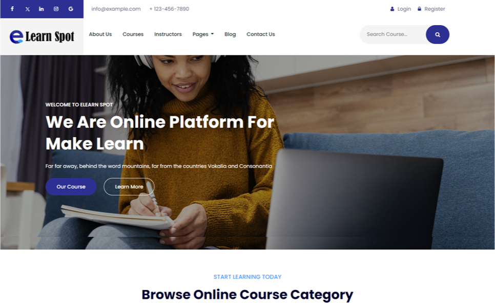 - Pre-designed Pages: Includes home, courses, about, blog, instructors, and contact pages.