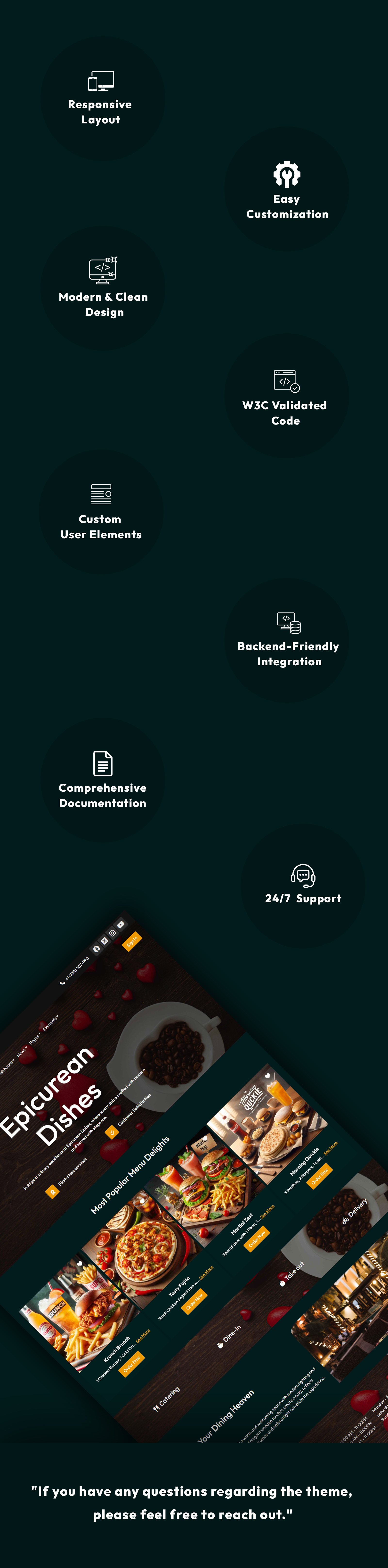 No need to worry about SCSS—clear documentation is provided for easy integration. Additionally, the theme’s JavaScript is fully developed to handle all front-end functionalities. Whether you're a restaurant owner or a front-end web designer, Epicurean Dishes is a professional and engaging solution for your website needs.