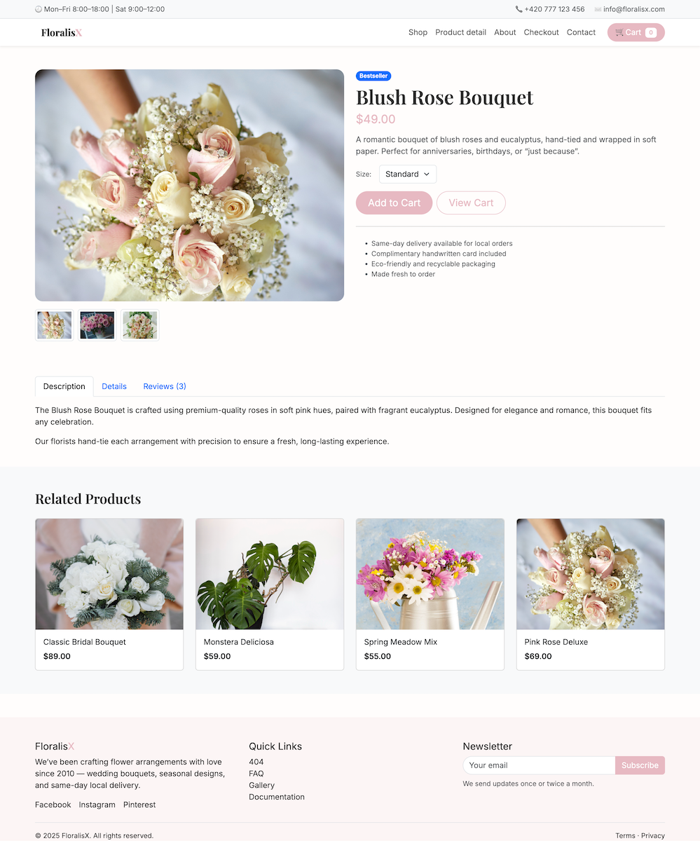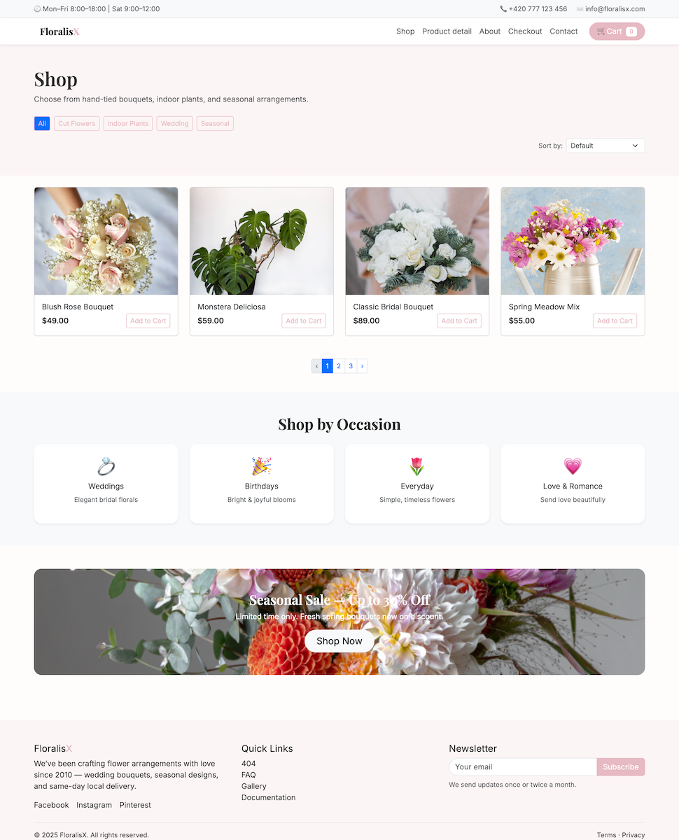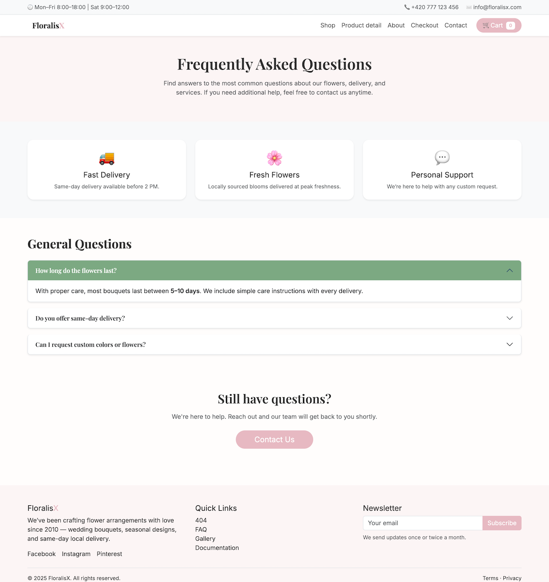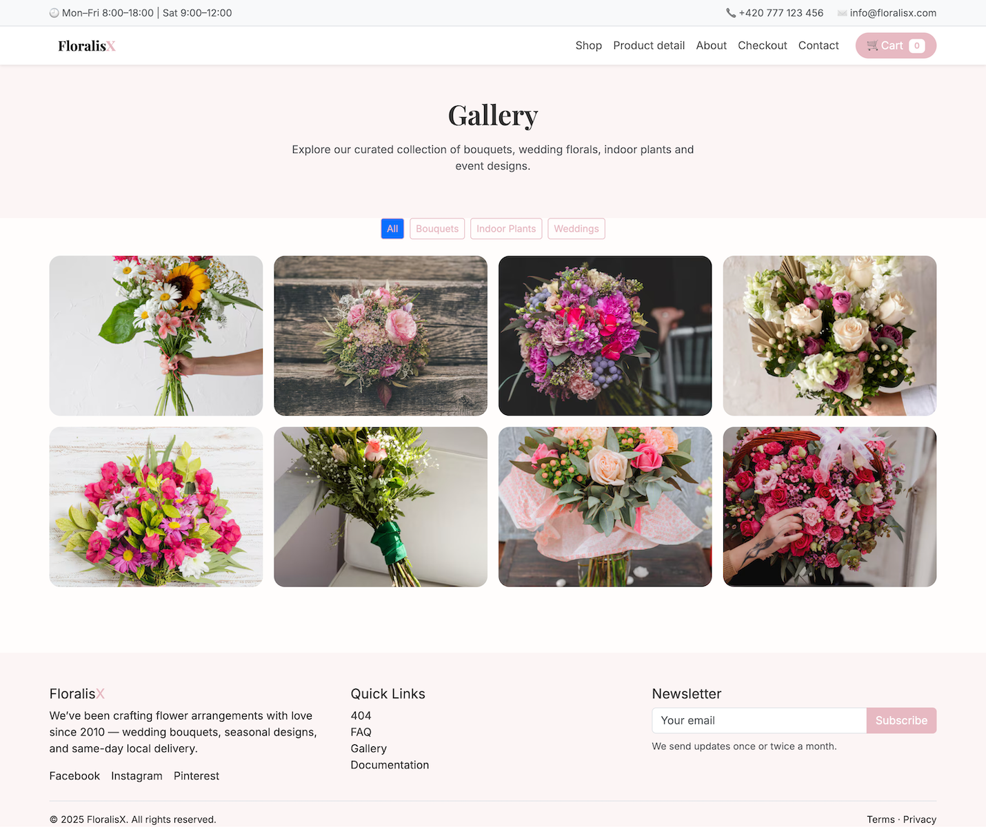 FloralisX also includes filters, product sorting, working newsletter subscription, a customizable gallery with categories, and a lightbox image viewer. The structure is simple and well-organized, making it easy to customize even for beginners.