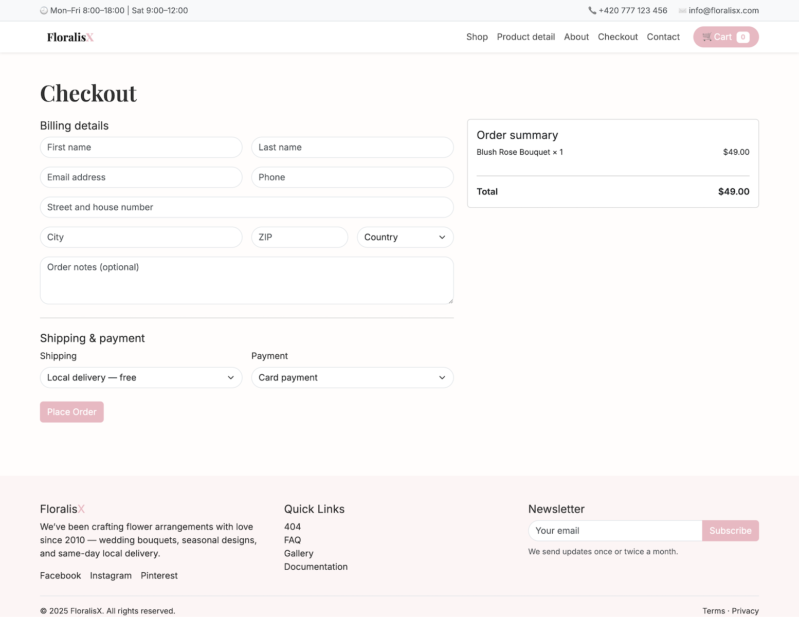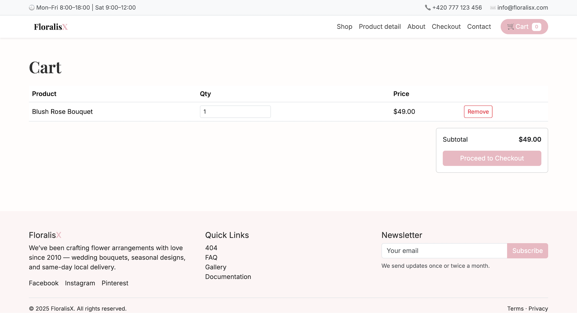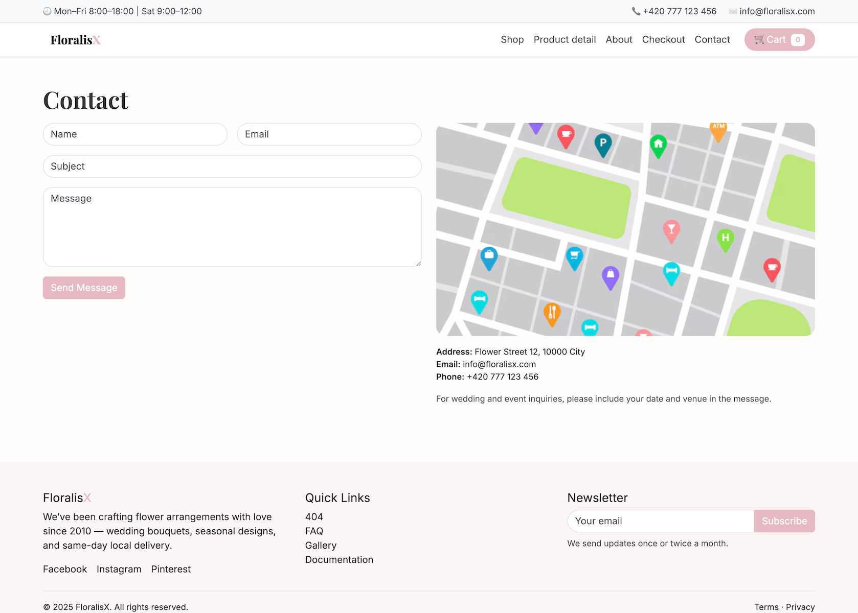 FloralisX also includes filters, product sorting, working newsletter subscription, a customizable gallery with categories, and a lightbox image viewer. The structure is simple and well-organized, making it easy to customize even for beginners.